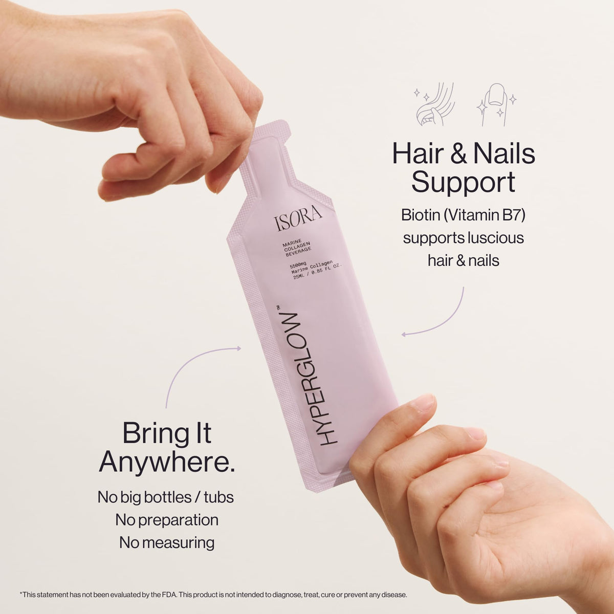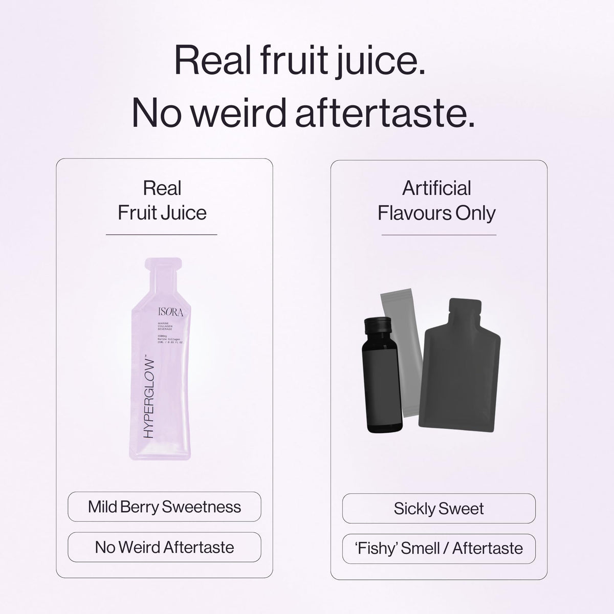 Indulge in Isora HyperGlow Liquid Collagen Shots for radiant beauty. Each pack contains 15 Mixed Berries shots with 5500mg Korean Marine Collagen and Biotin, offering a beauty drink on-the-go enriched with real juice.