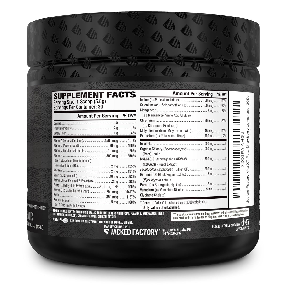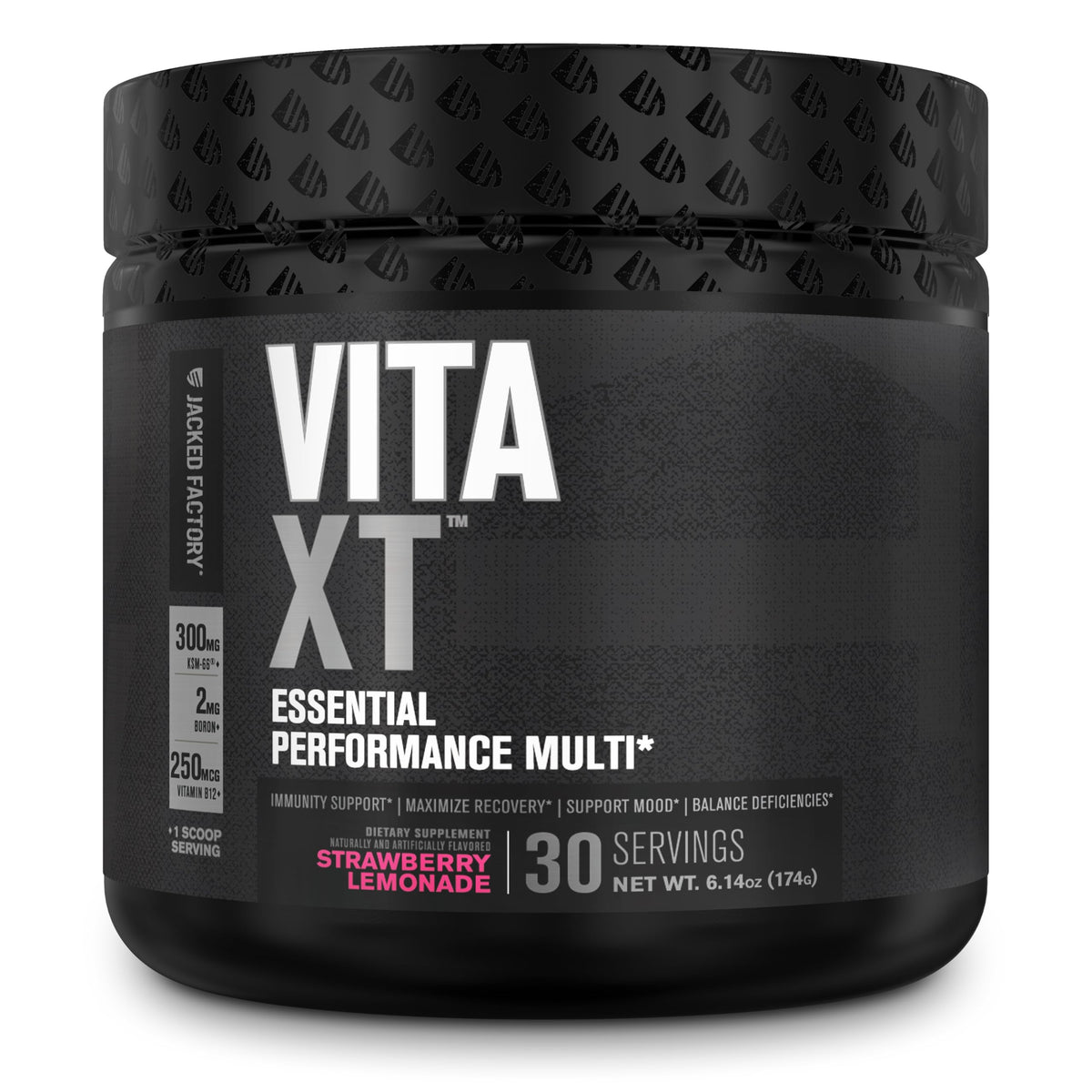 Enhance your daily performance with Jacked Factory Vita XT Performance Vitamin Powder. This daily multivitamin powder for men is packed with essential nutrients like KSM-66 Ashwagandha, Prebiotic Fiber, and Vitamins A, C, D, K, B6, B12, and more. Stay energized and focused throughout the day with a refreshing Strawberry Lemonade flavor.
