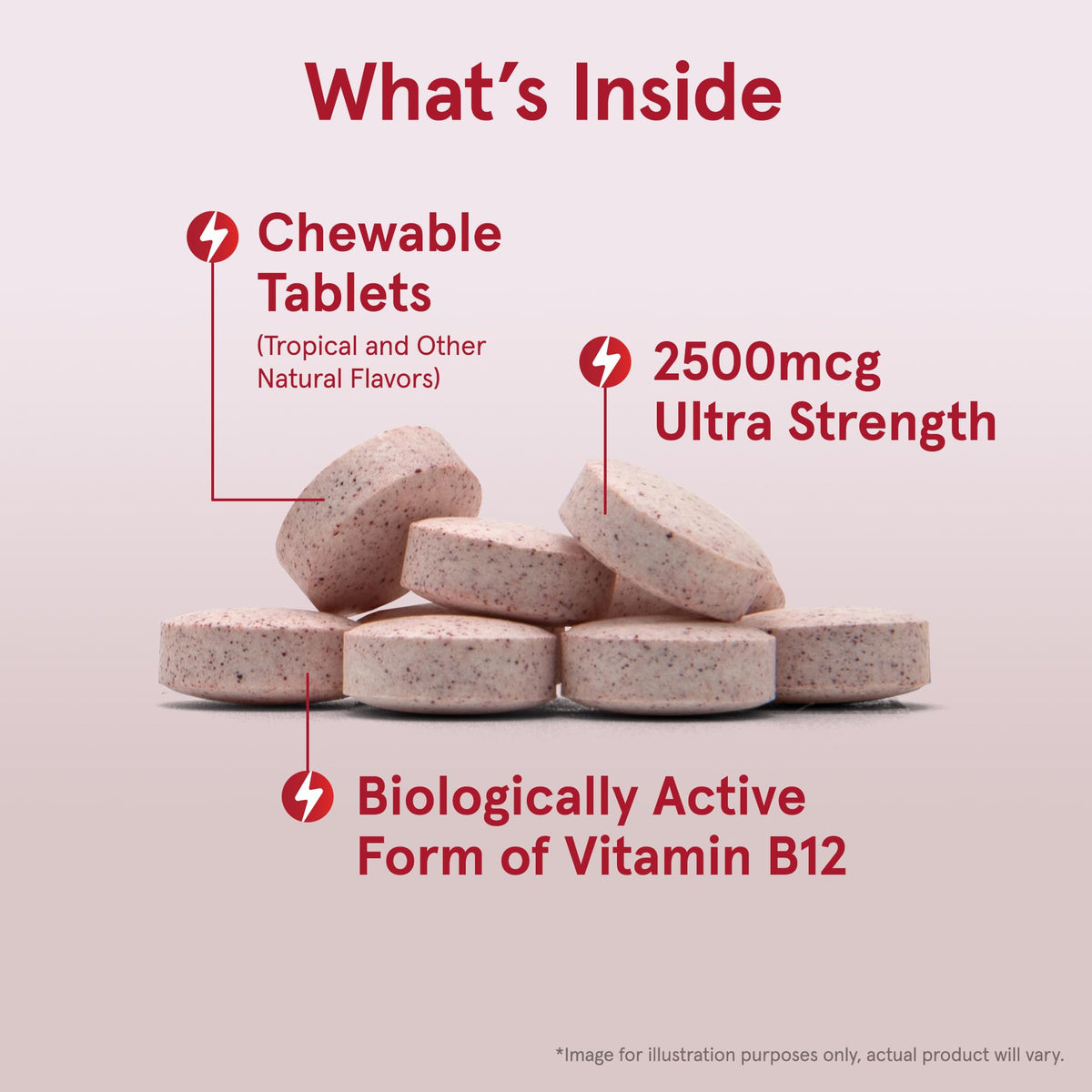 Each pack includes 100 tropical-flavored chewable B12 tablets.