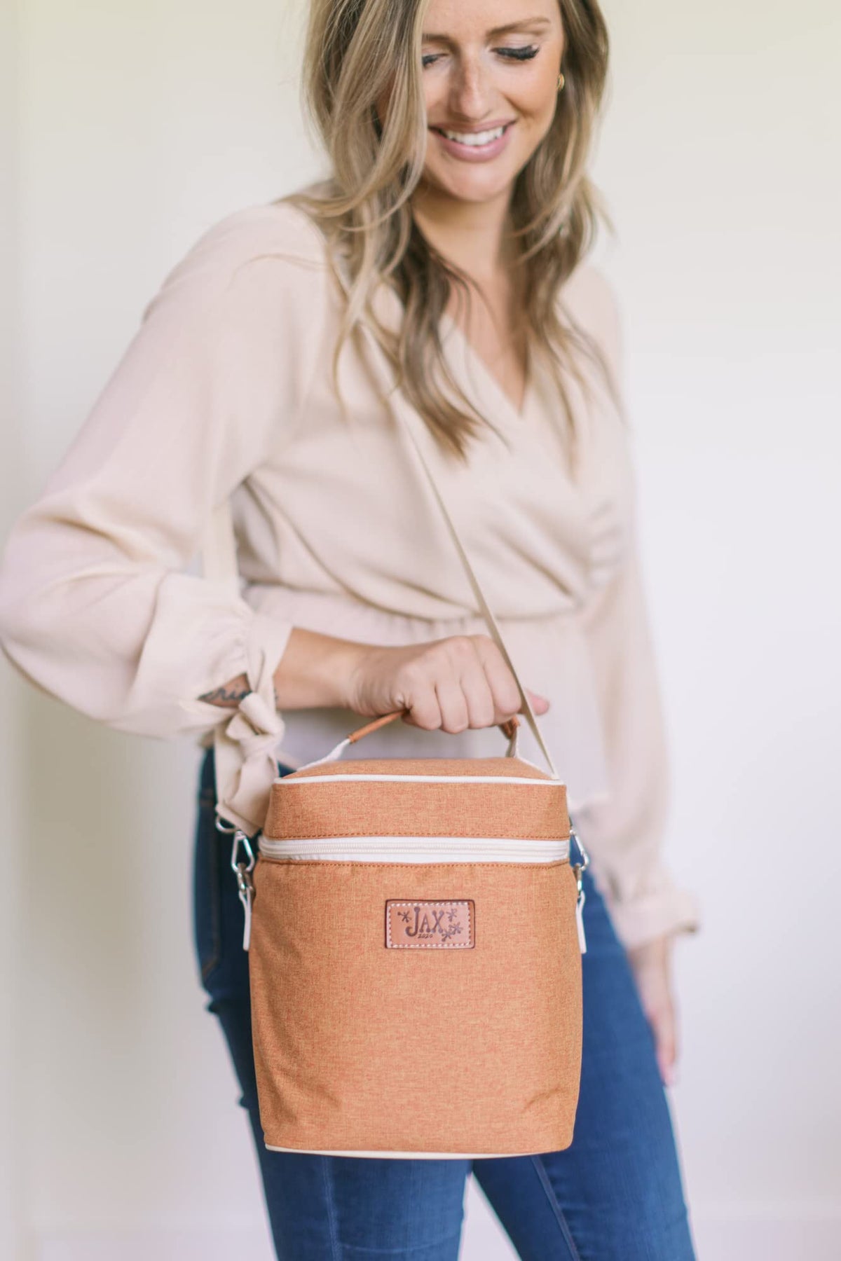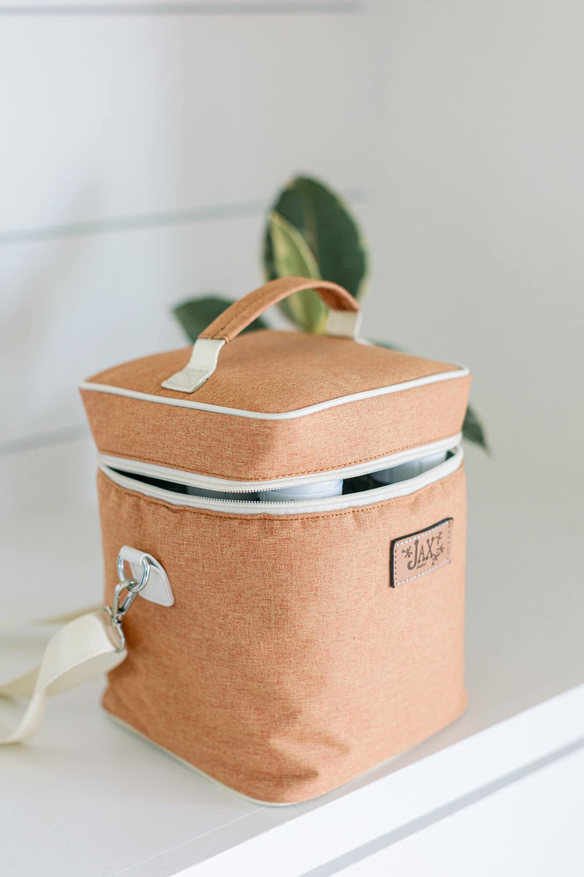 The Jax 2020 Breastmilk Cooler Bag is an insulated container designed for storing tall bottles. With an adjustable shoulder strap and mesh pocket for ice packs, it keeps milk or formula cold for extended periods.