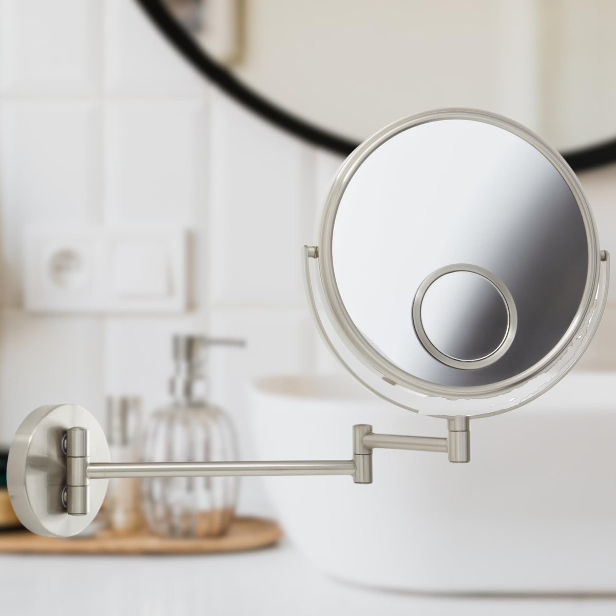 Get ready with precision using the Jerdon Wall Mount Makeup Mirror, featuring 10x and 15x magnification for flawless makeup application. The nickel finish adds a touch of elegance to your vanity area, while the wall-mount design ensures stability and convenience.