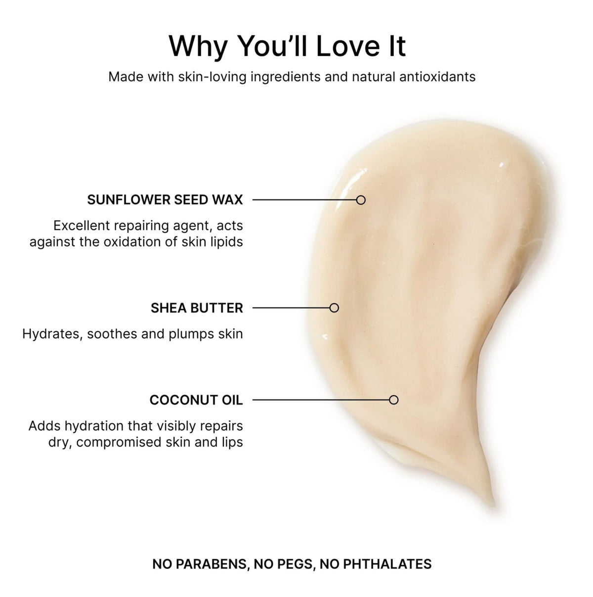 Ingredients :: Helianthus Annuus (Sunflower) Seed Oil*, Ricinus Communis (Castor) Seed Oil*, Sesamum Indicum (Sesame) Seed Oil*, Triisostearyl Citrate, Euphorbia Cerifera (Candelilla) Wax, Theobroma Cacao (Cocoa) Seed Butter*, Zea Mays (Corn) Starch*, Helianthus Annuus (Sunflower) Seed Wax, Shorea Robusta Resin, Rhus Verniciflua Peel Wax, Butyrospermum Parkii (Shea Butter)*, Cocos Nucifera (Coconut) Oil*, Rosa Canina (Rosehip) Seed Oil*, Rosmarinus Officinalis (Rosemary) Leaf*, Salvia Officinalis (Sage) Leaf*, Phenethyl alcohol, Ethylhexylglycerin, Tocopherol. May contain: Mica, Titanium Dioxide CI 77891, Iron Oxide (CI 77499, CI 77492, CI 77491).*Certified Organic Ingredients. Vegan formulation.