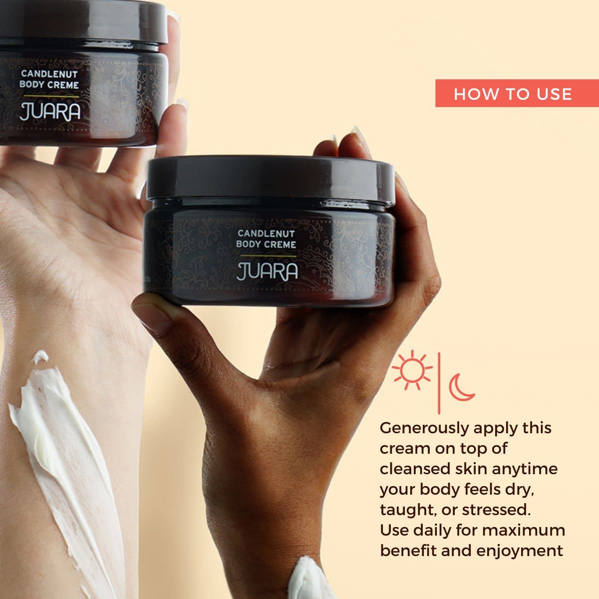Nourish your skin with Juara Candlenut Body Creme, a luxurious moisturizing lotion. This 7.5 oz cream hydrates dry skin on your body, hands, and feet, providing a soothing and rejuvenating experience with its cruelty-free and paraben-free formula.