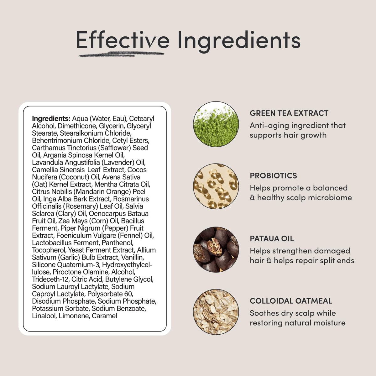 Ingredients: Aqua Water, Eau, Cetearyl Alcohol, Dimethicone, Glycerin, Glyceryl Stearate, Stearalkonium Chloride, Behentrimonium Chloride, Cetyl Esters, Carthamus Tinctorius Safflower Seed Oil, Argania Spinosa Kernel Oil, Lavandula Angustifolia Lavender Oil, Camellia Sinensis Leaf Extract, Cocos Nucifera Coconut Oil, Avena Sativa Oat Kernel Extract, Mentha Citrata Oil, Citrus Nobilis Mandarin Orange Peel Oil, Inga Alba Bark Extract, Rosmarinus Officinalis Rosemary Leaf Oil, Salvia Sclarea Clary Oil, Oenocarpus Bataua Fruit Oil, Zea Mays Corn Oil, Bacillus Ferment, Piper Nigrum Pepper Fruit Extract, Foeniculum Vulgare Fennel Oil, Lactobacillus Ferment, Panthenol, Tocopherol, Yeast Ferment Extract, Allium Sativum Garlic Bulb Extract, Vanillin, Silicone Quaternium3, Hydroxyethylcellulose, Piroctone Olamine, Alcohol, Trideceth12, Citric Acid, Butylene Glycol, Sodium Lauroyl Lactylate, Sodium Caproyl Lactylate, Polysorbate 60, Disodium Phosphate, Sodium Phosphate, Potassium Sorbate, Sodium Benzoate, Linalool, Limonene, Caramel