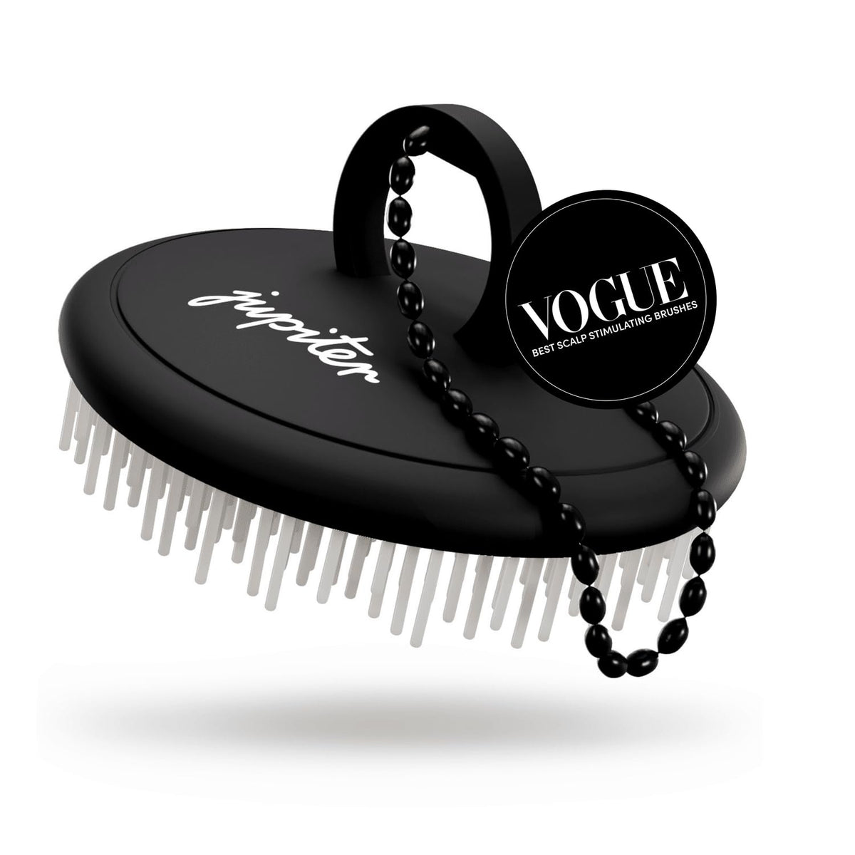 Revitalize your hair with Jupiter Exfoliator Brush. This black brush is designed for removing dandruff, enhancing circulation, and supporting hair growth for all hair types.