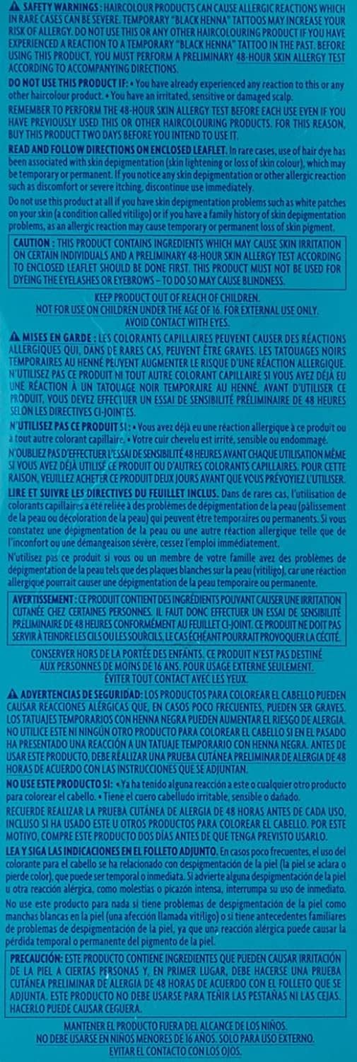Ingredients: Colour base base colorante colour base, water eau aqua, ethanolamine, pPhenylenedamine, canola oil fatty acid, resorcinol, mAminophenol, cetearyl alcohol, fragranceparfum, steaneth21, 0leyl alcohol, petroleum, aloe barbadensis leaf juice, chamomilla recutita matricaria flower extract, sodium sulphite, erythorbic acid, 2Amino Hydroxyethylaminoanisole sulfate, cetearyl glucoside, dicetyl phosphate, ceteth10 phosphate, cetyl alcohol, etidronic acid, amyl cinnamal RD005028