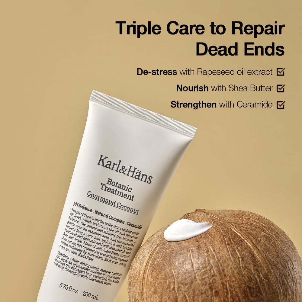 Karl&Hans Botanic Gourmand Coconut Conditioner Hair Treatment - Organic, Silicone-Free, Moisturizing with Ceramide, Coconut Oil & Natural Extracts for All, Dry, Damaged, Frizzy Hair, 6.76 fl oz