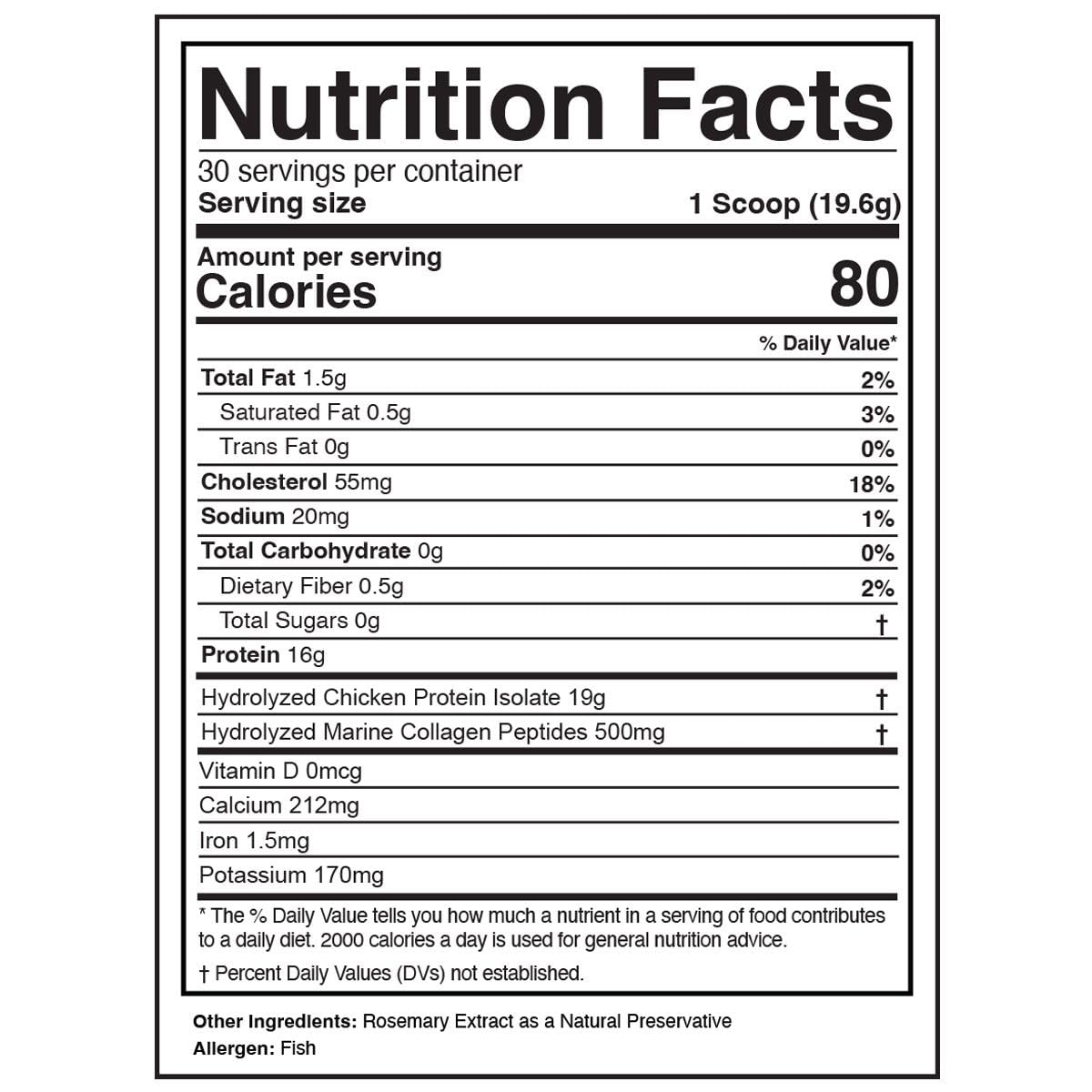 Special Ingredients :: Hydrolyzed Chicken Protein Isolate, Hydrolyzed Marine Collagen Peptides, Protein, Calcium, Iron, Potassium, Stevia