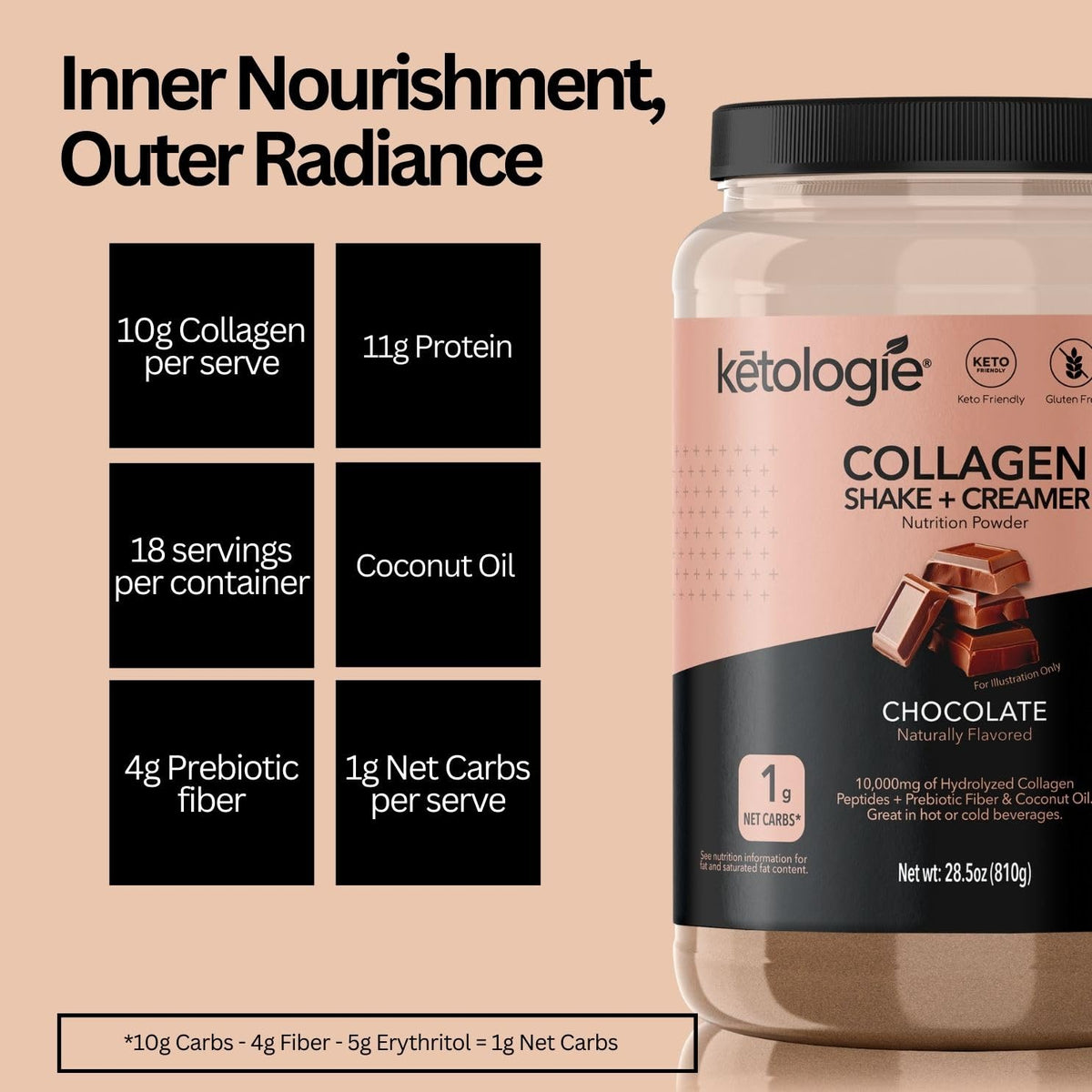 Ketologie Keto Collagen Shake (Chocolate) - with Coconut Oil, Prebiotics, Grass-Fed Hydrolyzed Collagen Peptides Type I & III, Low Carb, Gluten Free, 1.78lbs.