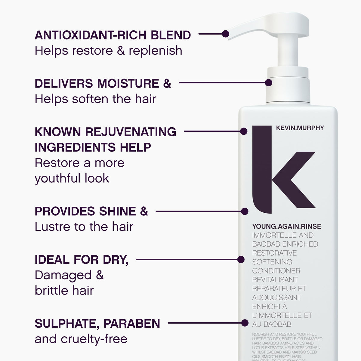 Revive Your Hair's Youthful Radiance with KEVIN MURPHY Young Again Rinse Conditioner. This 33.6 Fl Oz formula rejuvenates and nourishes your hair, leaving it soft, smooth, and vibrant.