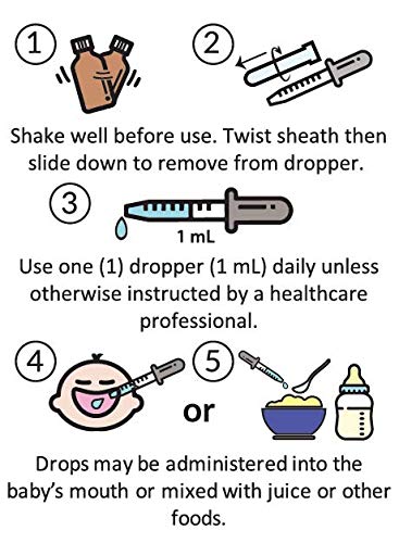 Directions :: Shake well before use. Use one (1) dropper (1 mL) daily unless otherwise instructed by a healthcare professional. Drops may be administered into the baby's mouth or mixed with juice or other foods.