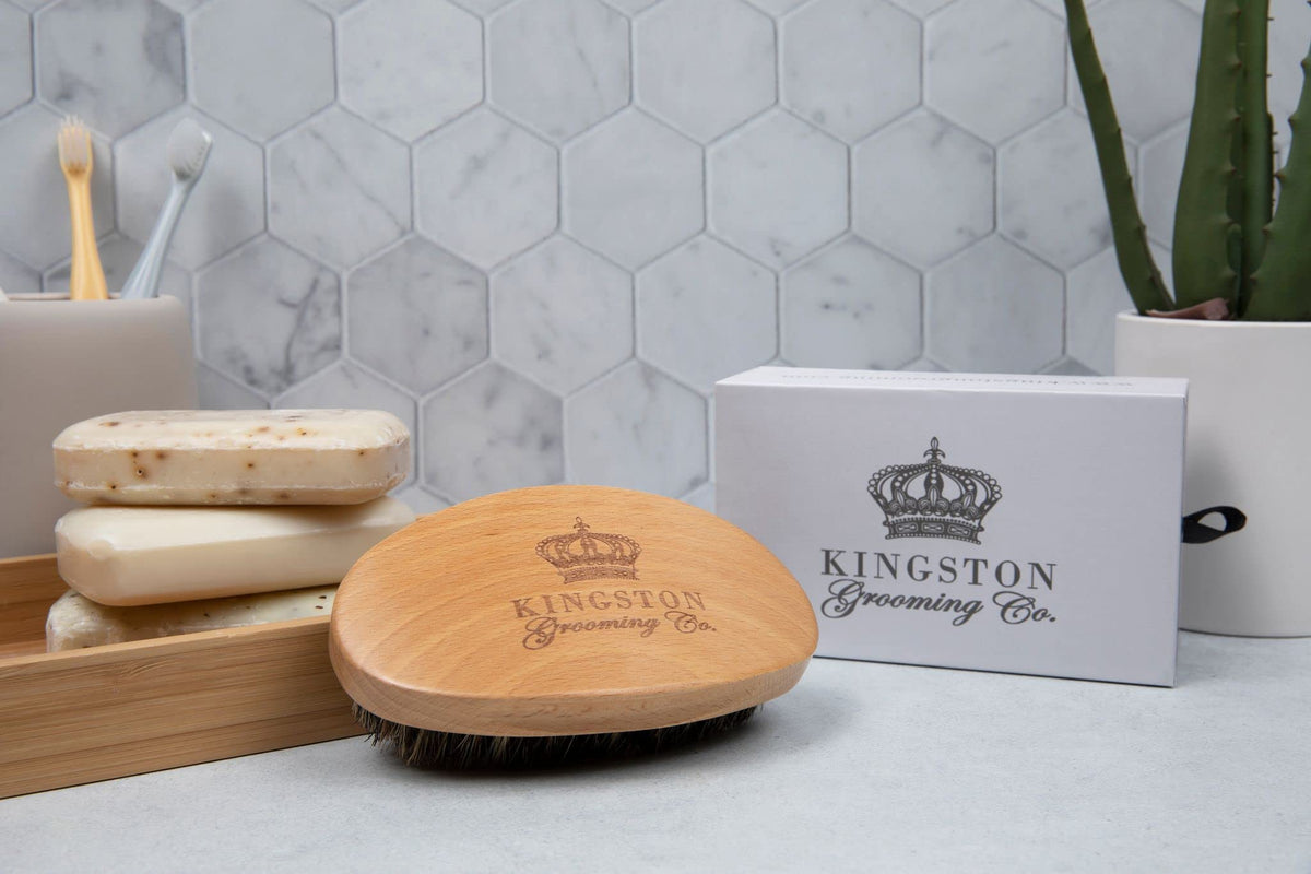 Groom your hair and beard with Kingston Grooming Co. Original Wave Brush for Men 360. This soft boar bristle brush is perfect for styling hair, grooming beards, or creating waves effortlessly. Comes with a travel box for on-the-go styling.