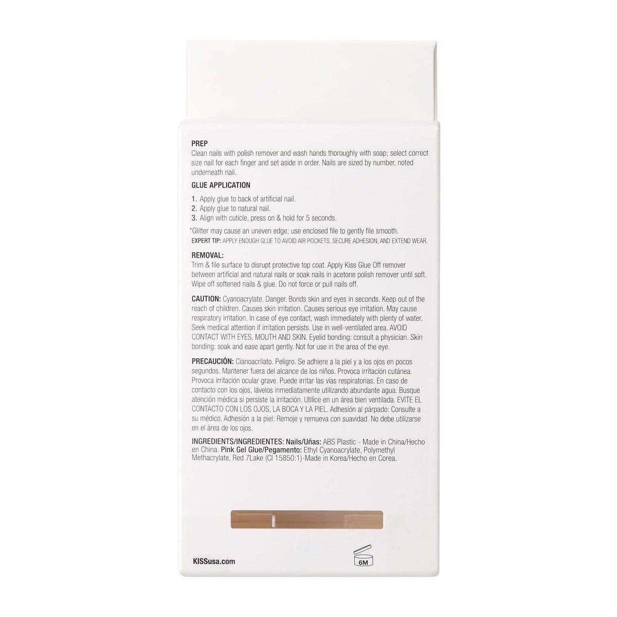 Directions :: PREP: Clean nails with polish remover and wash hands thoroughly with soap; select correct size nail for each finger and set aside in order. Nails are sized by number, noted underneath nail., GLUE APPLICATION:, 1. Apply glue to back of artificial nail., 2. Apply glue to natural nail., 3. Align with cuticle, gently press on & hold for 5 seconds., EXPERT TIP: Apply enough glue to avoid air pockets, secure adhesion, and extend wear., REMOVAL: Trim & file surface to disrupt protective top coat. Soak nails in acetone polish remover until soft. Wipe off softened nails & glue. Do not force or pull nails off.
