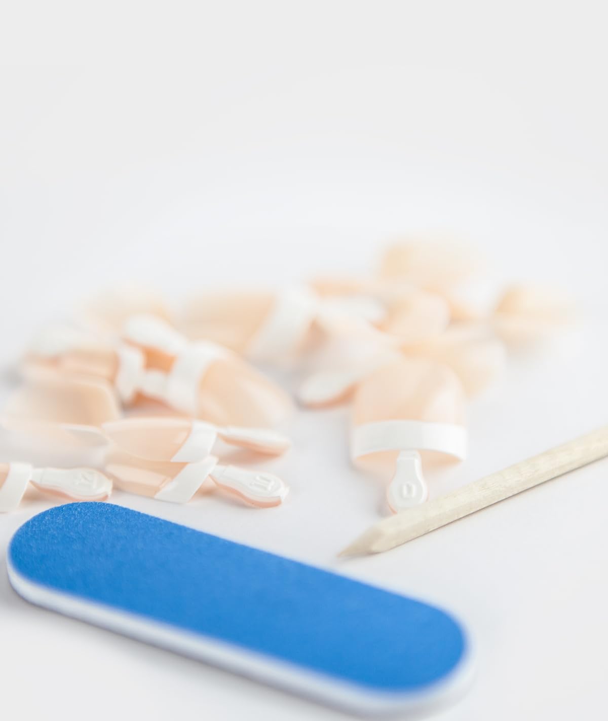 Clean nails with acetonebased polish remover. Select the correct size nails for each finger. If needed, file sides for best fit. Apply glue to nail. Apply thin layer of glue to natural nails. Starting at cuticle, press on and hold for 5 seconds. To remove trim and file surface to break through protective topcoat. Use Kiss all or One Artificial Nail Remover. Otherwise, soak nails in acetone based polish remover until soft. Wipe off softened plastic and glue.