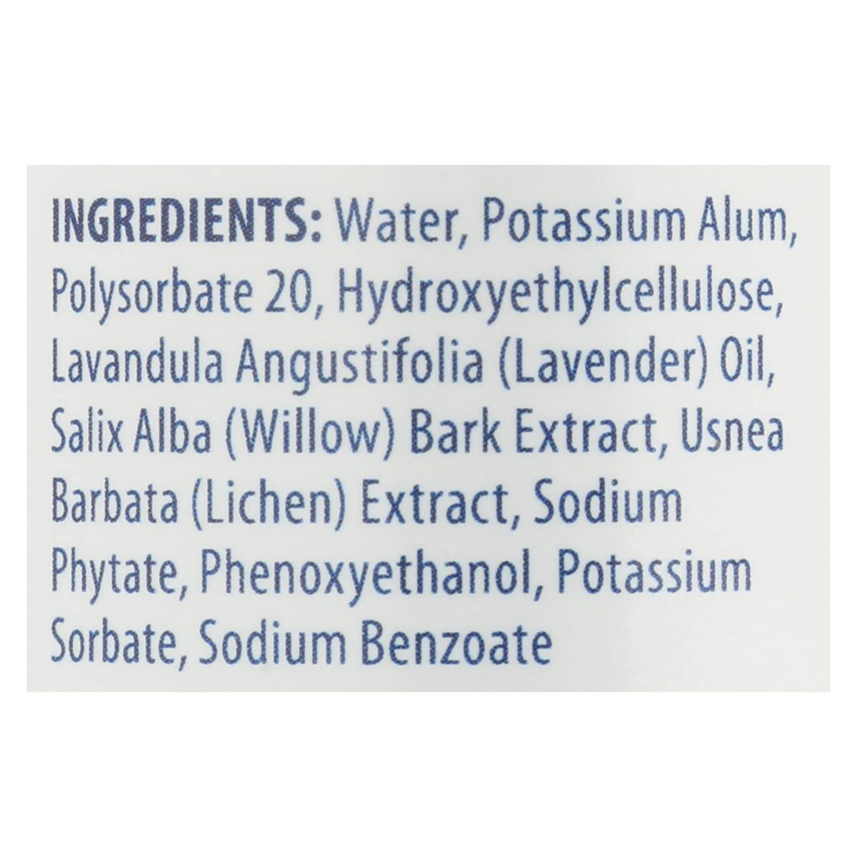 Ingredients: Water Aqua, Potassium Alum, Polysorbate 20, Hydroxyethylcellulose, Lavandula Angustifolia Lavender Oil, Salix Nigra Willow Bark Extract, Usnea Barbata Lichen Extract, Sodium Hydroxide, Sodium Phytate, Phenoxyethanol, Potassium Sorbate, Sodium Benzoate