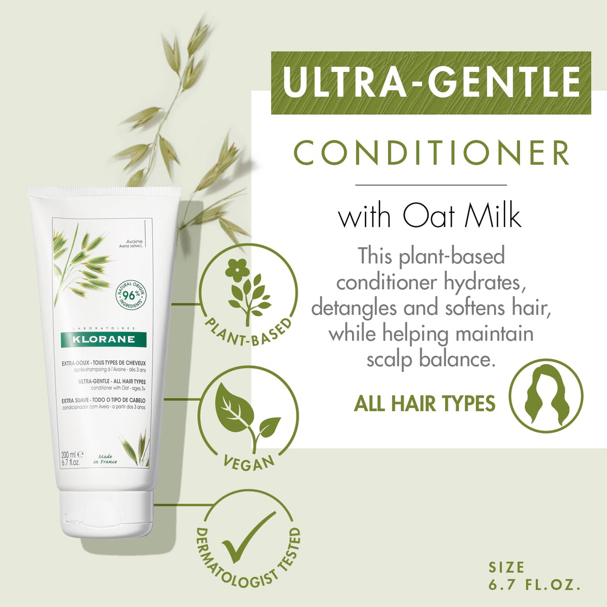 Short Product Description :: This plant-based Conditioner with Oat milk softens, hydrates and detangles hair while respecting the natural balance of the scalp. The dermatologist tested formula for all hair types is gentle enough for sensitive scalps.