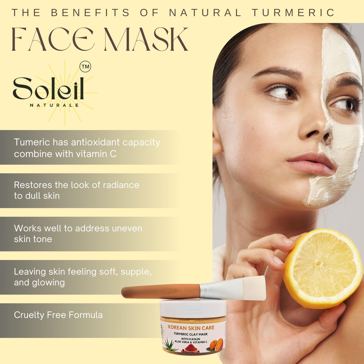 Korean Skin Care - Organic Turmeric Clay Mask Kit with Kaolin, Aloe Vera, Vitamin C, Shea Butter, Cruelty Free - Wooden Brush, Soft Cleansing Pad Cosmetic Remover
