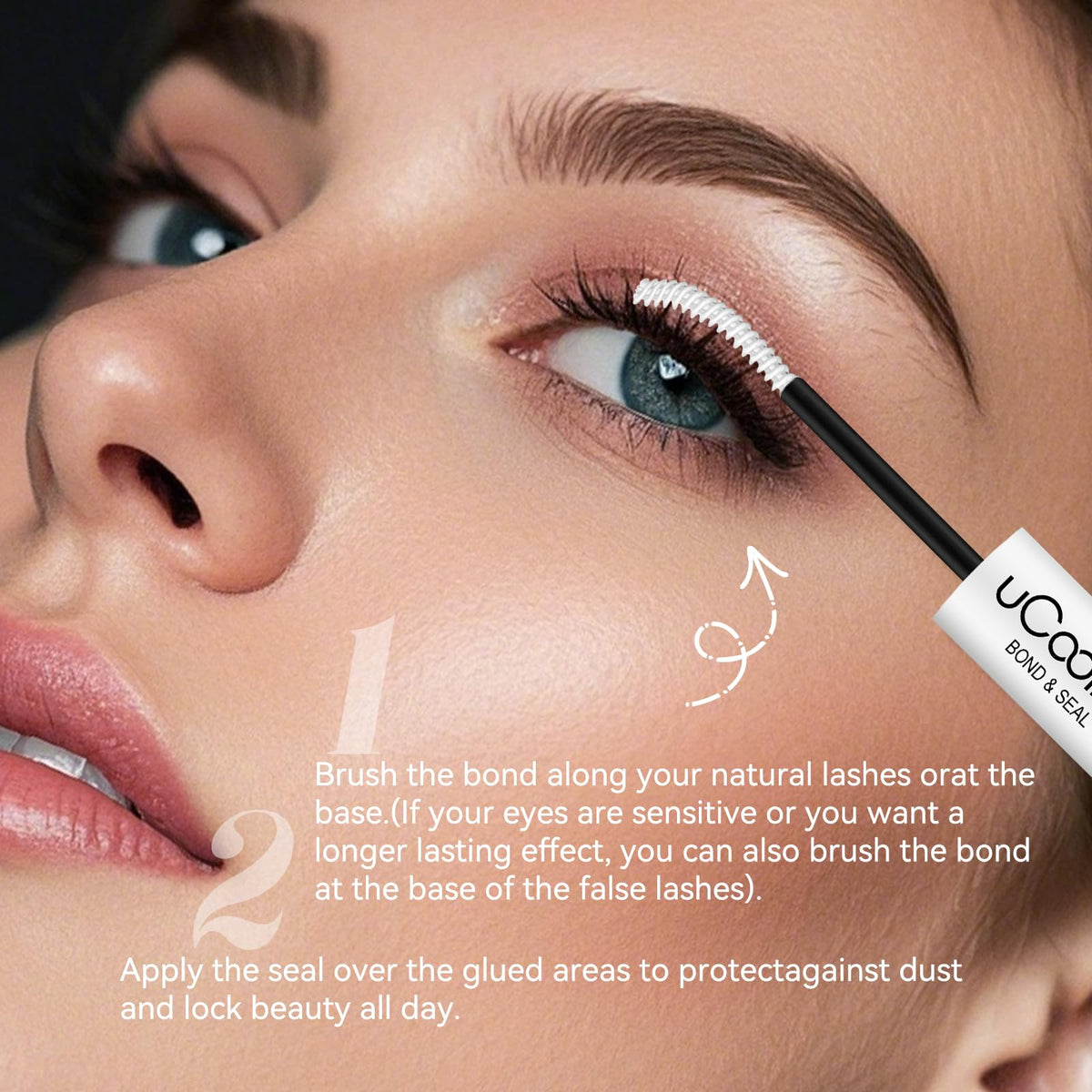 1. Clean the area where the lashes will be applied. 2. Apply a small amount of uCoolMe Bond and Seal to the lash band. 3. Wait for the glue to become tacky. 4. Attach the lash to the natural lash line. 5. Press gently to secure.