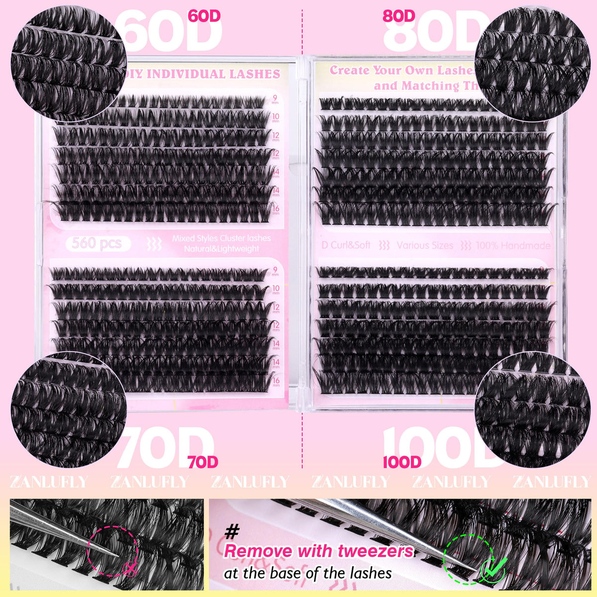 Lash Clusters D-Curly Individual Lashes Volume Eyelash Clusters Bulk zanlufly Thick Lash Extension 560Pcs Natural DIY Eyelash Extension (9-16MM,60D+70D+80D+100D)
