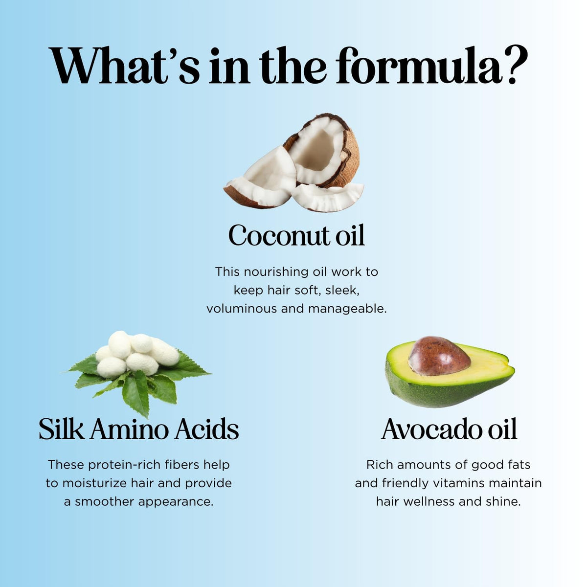 Ingredients: Water Aqua, Cetearyl Alcohol, Cetrimonium Chloride, Gluconolactone, Quaternium91, Cocos Nucifera Coconut Oil, Polyquaternium10, Behentrimonium Chloride, Persea Gratissima Avocado Oil, Argania Spinosa Argan Kernel Oil, Silk Amino Acids, Glycerin, Propanediol, Fragrance Parfum, Cetrimonium Methosulfate, 2Amino2methyl1propanol, 2Methylamino2methyl1propanol, Calcium Gluconate, Sodium Benzoate.