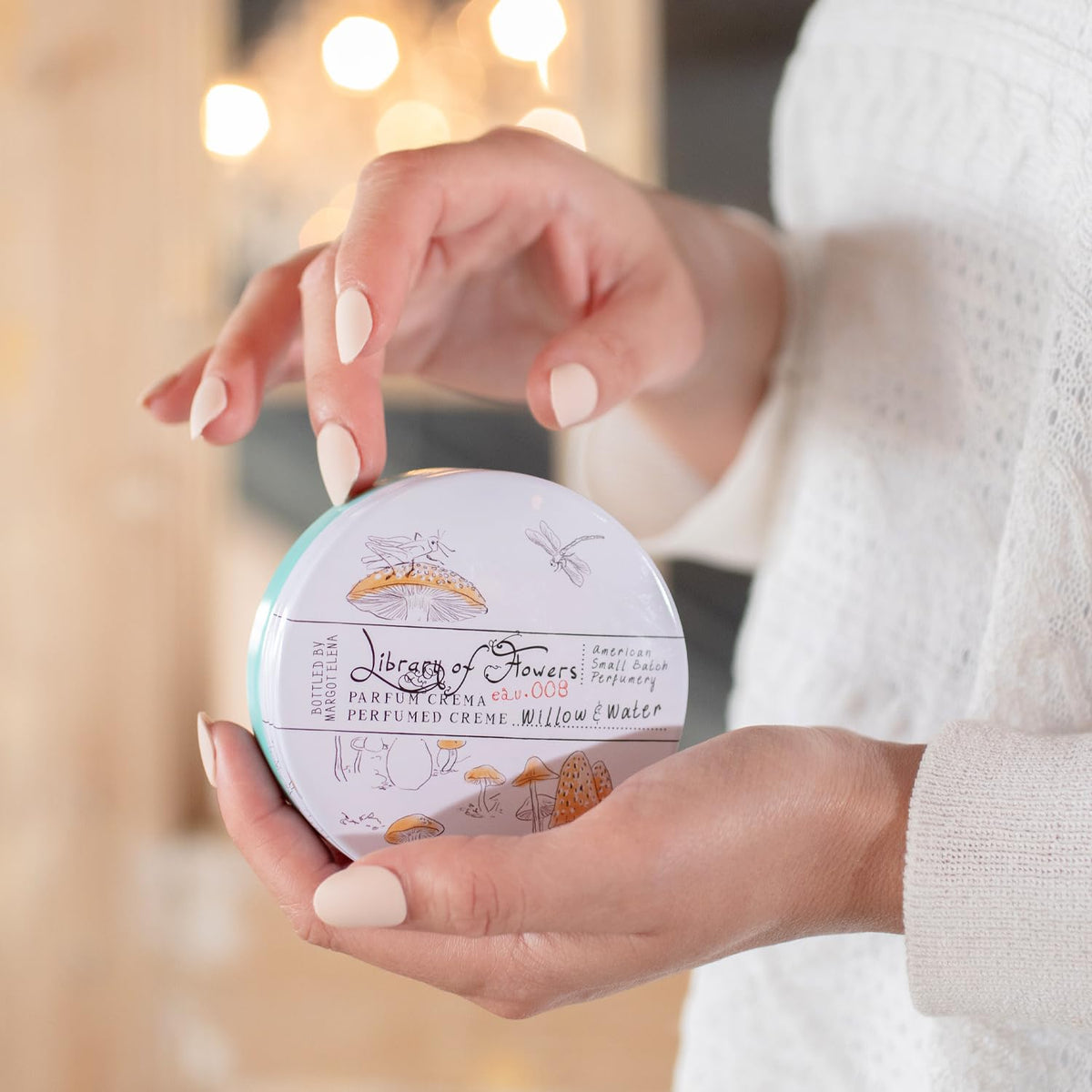 Library of Flowers Willow & Water Parfum Crema offers a blend of cut greens, flowering lotus, and watercress scents. This 2.5 oz. perfumed body lotion provides a refreshing and invigorating fragrance experience for women.