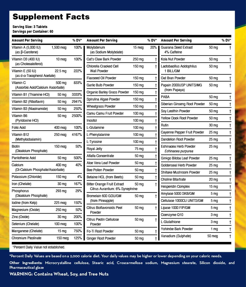 Ingredients: Calcium chelateascorbate Potassium amino acid complex Phosphorous calcium phosphate Iodine kelp Magnesium chelateoxide Zinc protein chelate Selenium amino acid complex Manganese protein chelate Chromium GTFprotein chelate Molybdenum DigestiveAid Enzymes Acidophilus Betaine HCL beets Bromelain pineapple Citrus Pectin Papain papaya Amylase Cellulase Lipase Whole Foods Spirulina Garlic Bee Pollen Oat Bran Siberian Ginseng Herbs Alfalfa Concentrate Aloe Vera FoTi Ginger Root Kola Nut Yellow Dock Cayenne Dandelion Echinacea Ginkgo Biloba Goldenseal Shiitake Other Nutritional Factors Cats Claw Chlorella Flaxseed Oil dry Sprouted Barley Juice Wheatgrass Juice LGlutamine LPhenylalaline LTyrosine RNA Royal Jelly Choline bitartrate Inositol Bioflavinoids DNA Para Amino Benzoic Acid Rutin Hesperidin CoQ10 LGlutathione Vanadium