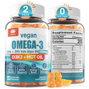 LILICARE Vegan Omega3 Gummies 1280mg + Vitamin D3 K2, Sugar Free Omega 3 Fish Oil Alternative w/EPA 600mg & DHA 400mg & MCT Oil, No Fish Taste, from Marine Algae Oil, for Brain, Eye, Immunity, 2 Pack