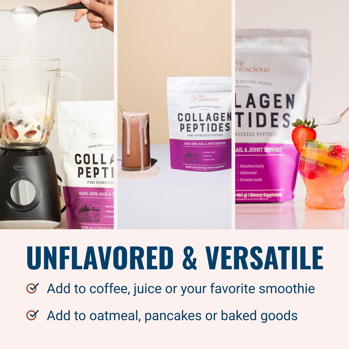 Live Conscious Collagen Peptides Powder - Naturally-Sourced Hydrolyzed Collagen Powder - Hair, Skin, Nail, and Joint Support - Type I & III Grass-Fed Collagen Supplements for Women and Men - 16oz