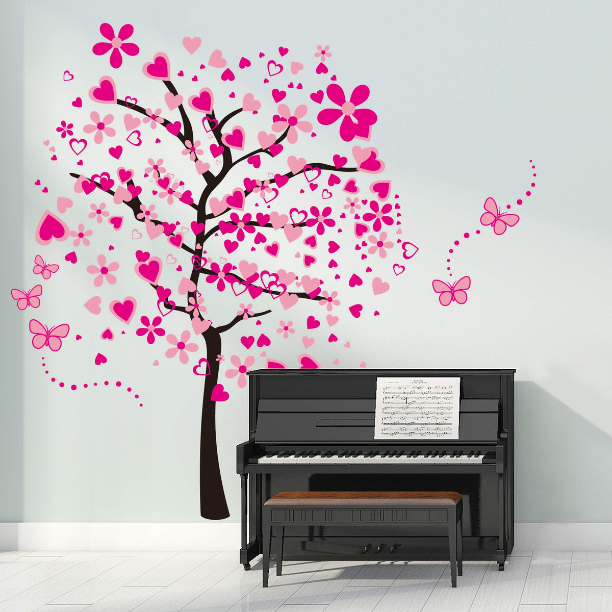 LiveGallery Removable Huge Pink Cartoon Heart Flower Tree Wall Decals Red Butterfly Wall Stickers Home Art Decor for Kids Girls Babys Bedroom Nursery Room Living Room Decorations