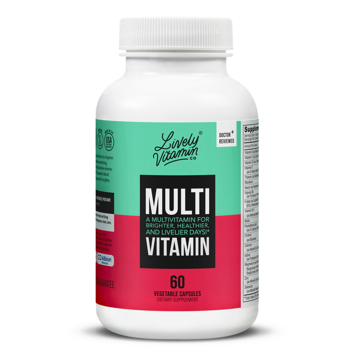 LIVELY VITAMIN CO. Multivitamin is a comprehensive blend of 37 essential vitamins, minerals, and extracts to support energy, memory, and overall well-being. Experience the benefits of a healthy mind and body with these vegetarian capsules!