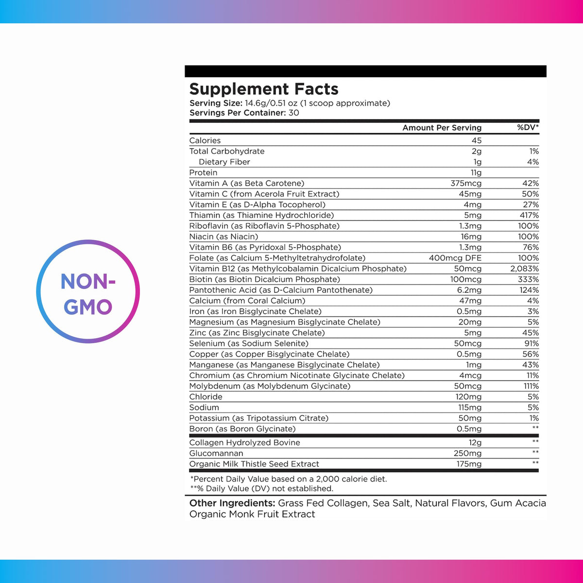 Ingredients: Protein, Vitamin A as Beta Carotene, Vitamin C from Acerola Fruit Extract, Vitamin E as DLAlpha Tocopherol, Thiamin as Thiamine Hydrochloride, Riboflavin as Riboflavin 5Phosphate, Niacin as Niacin, Vitamin B6 as Pyridoxal 5Phosphate, Folate as Calcium 5Methyltetrahydrofolate, Vitamin B12 as Methylcobalamin Dicalcium Phosphate, Biotin as Biotin Dicalcium Phosphate, Pantothenic Acid as DCalcium Pantothenate, Calcium from Coral Calcium, Iron as Iron Bisglycinate Chelate, Magnesium as Magnesium Bisglycinate Chelate, Zinc as Zinc Bisglycinate Chelate, Selenium as Sodium Selenite, Cooper as Copper Bisglycinate Chelate, Manganese as Manganese Bisglycinate Chelate, Chromium as Chromium Nicotinate Glycinate Chelate, Molybdenum as Molybdenum Glycinate, Chloride, Sodium, Potassium as Tripotassium Citrate, Boron as Boron Glycinate, Collagen Hydrolyzed Bovine, Glucomannan, Organic Milk Thistle Seed Extract Grass Fed Collagen, Sea Salt, Natural Flavors, Gum Acacia, Organic Monk Fruit Extract