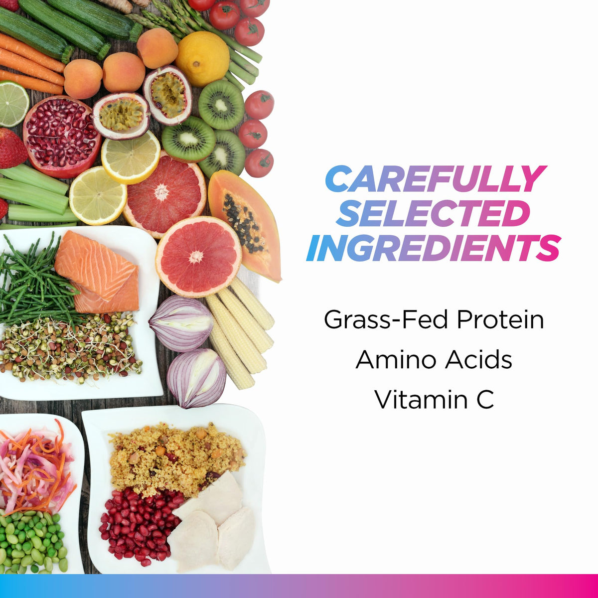 Ingredients :: Vitamin C (as Ascorbic Acid), Iron, Chloride, Sodium, Collagen Hydrolyzed Bovine --- Other Ingredients: Grass Fed Collagen, Natural Flavor, Organic Whole Pea Protein, Sea Salt, Organic Stevia Leaf Extract