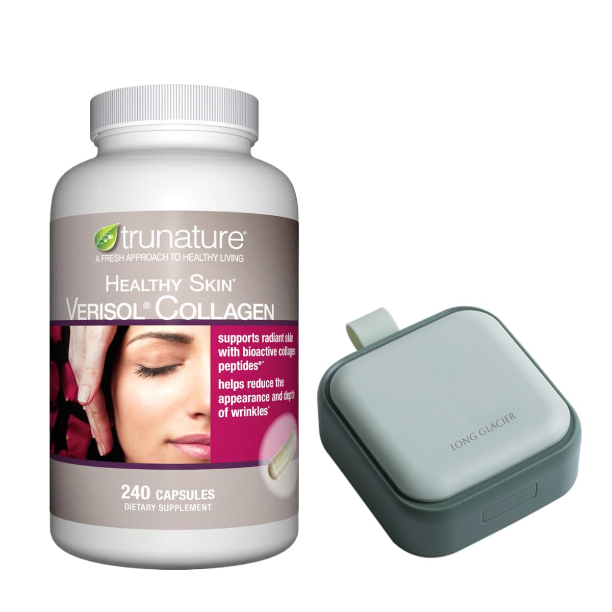 Nourish your skin with LONG GLACIER Trunature Healthy Skin Verisol Collagen. These capsules contain Verisol Collagen for skin health, bundled with a small cute pill container for convenient storage. Each bundle includes 240 capsules.