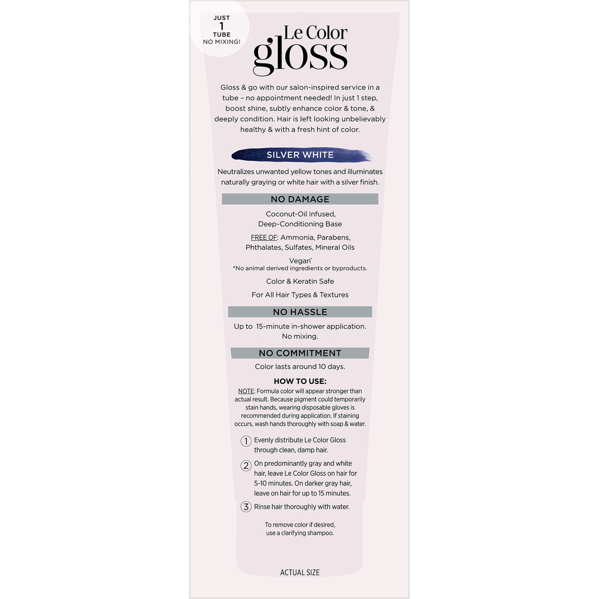 Enhance your gray hair with L'Oreal Paris Le Color Gloss One Step Toning Gloss. This In-Shower Hair Toner in Silver White provides a deep conditioning treatment, leaving your hair with a beautiful, glossy finish.