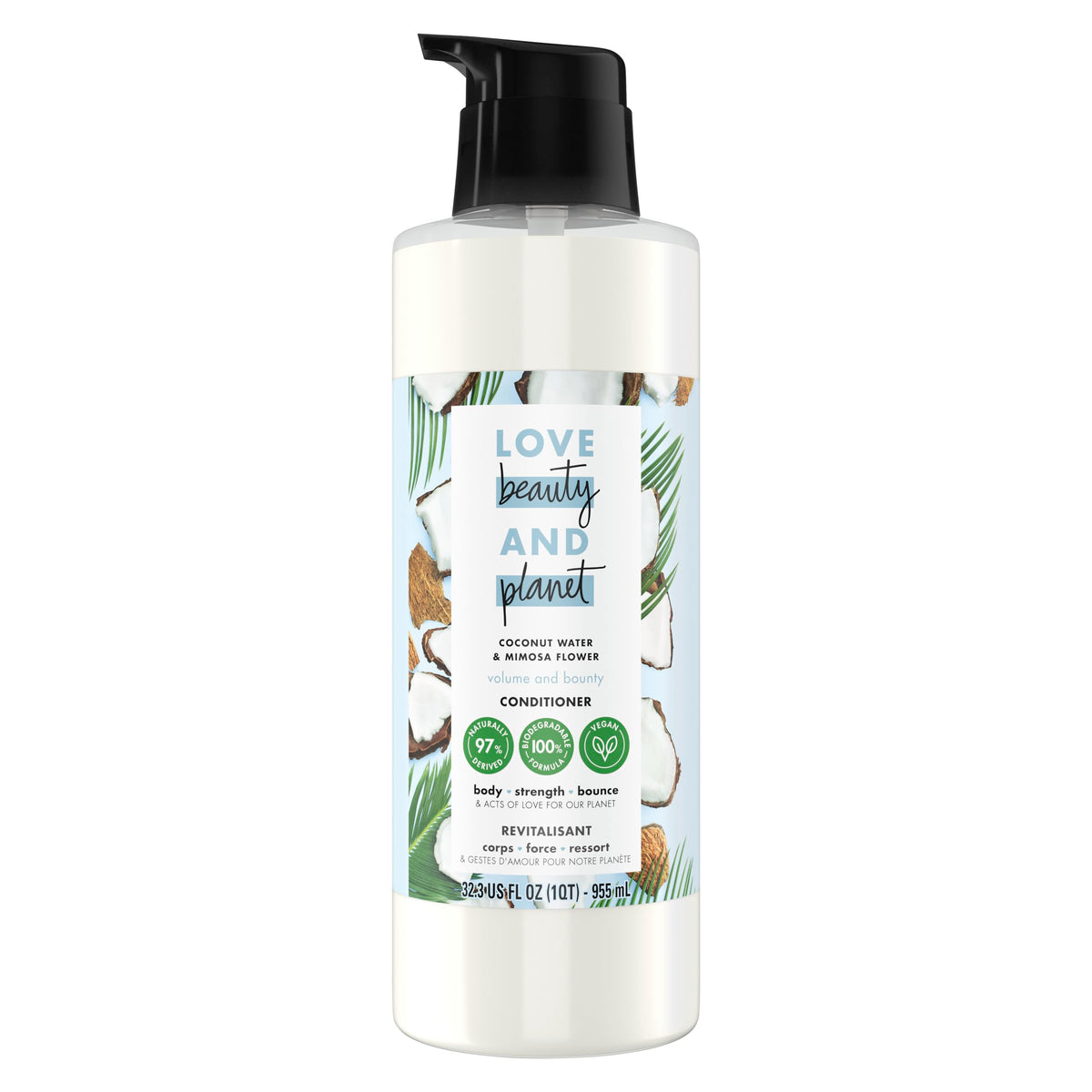 Love Beauty and Planet Volumizing Conditioner for Fine Hair offers coconut water and mimosa flower in a 32 oz refill bottle for use with a reusable aluminum bottle.