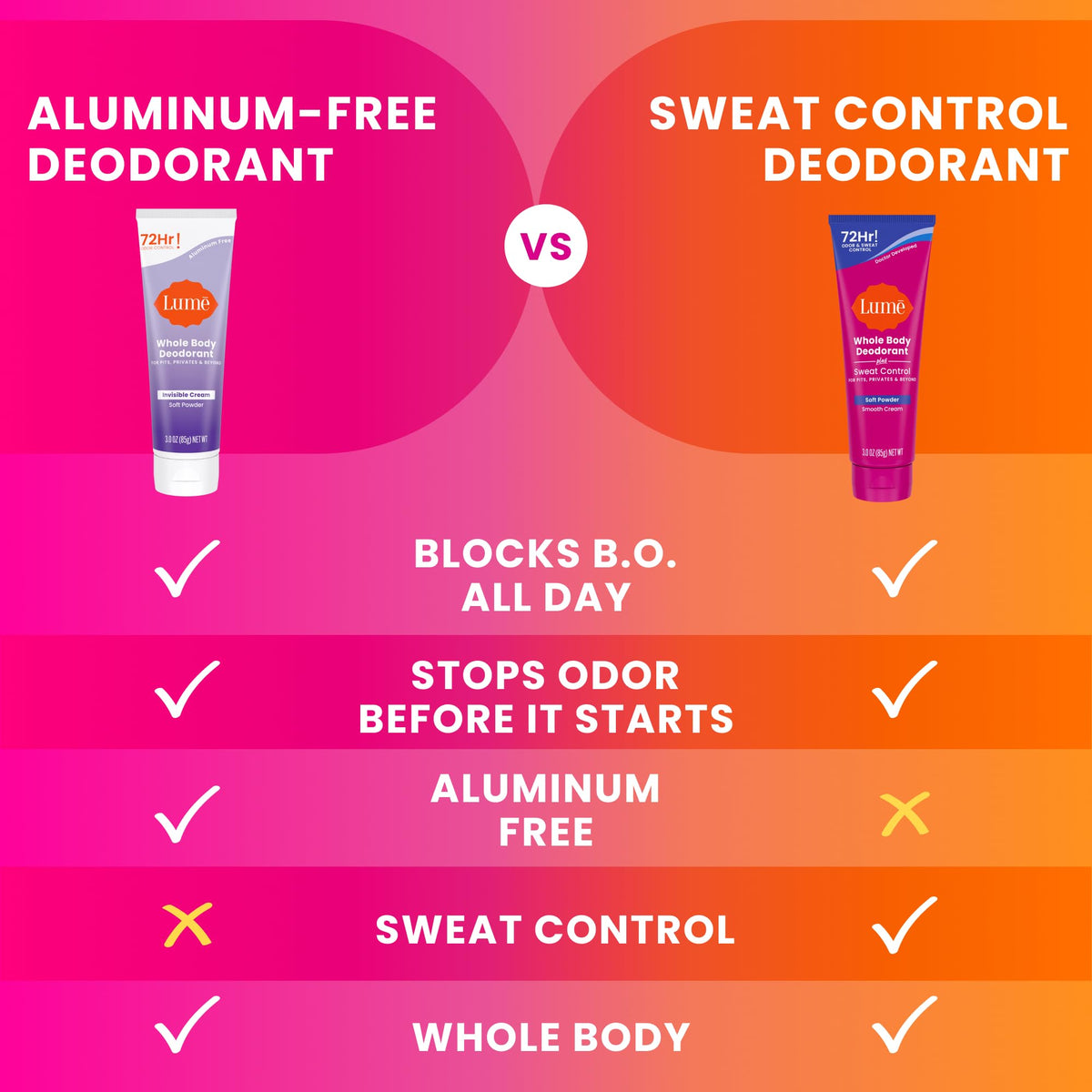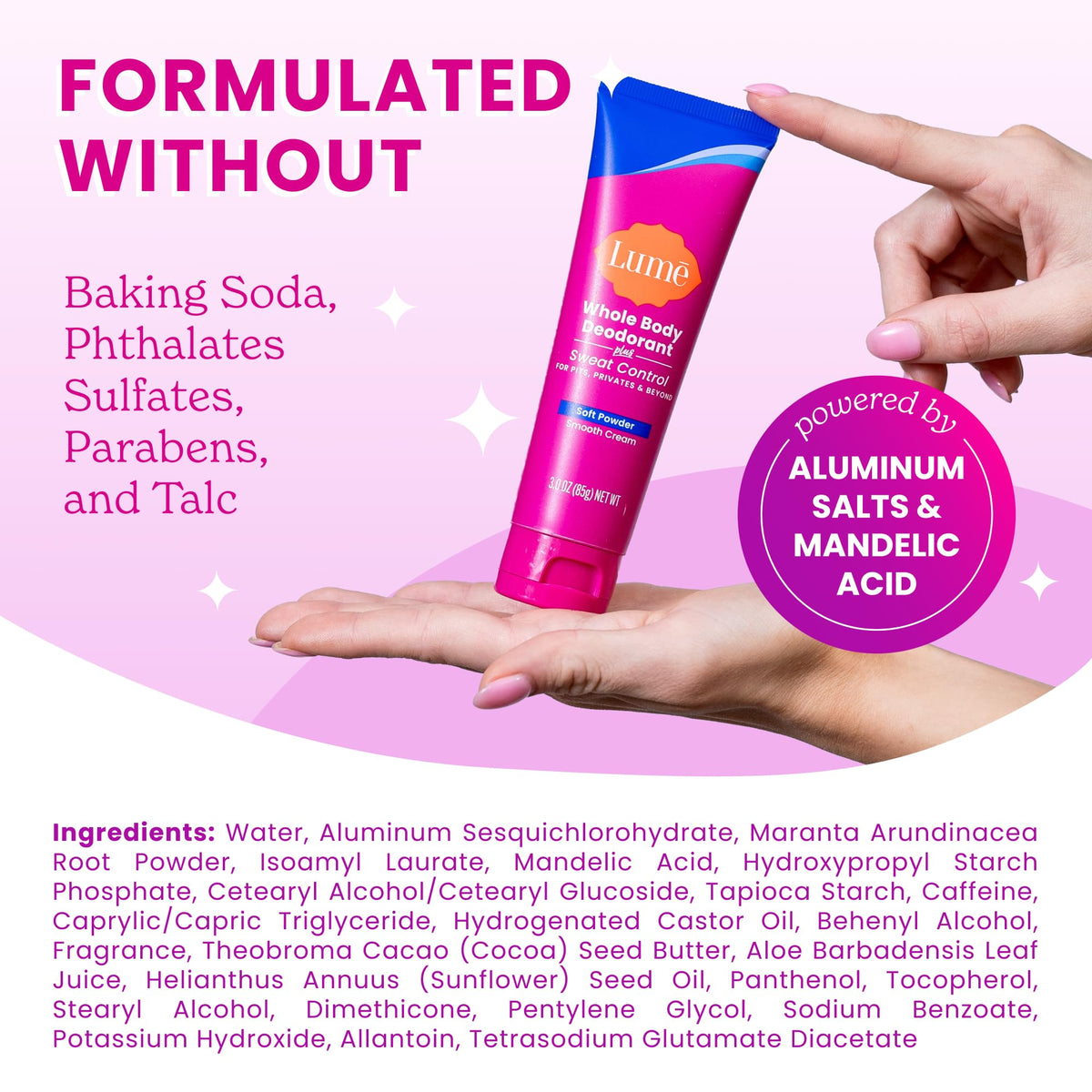 Lume Whole Body Deodorant Plus Sweat Control - Smooth Cream Tube - 72 Hour Odor And Sweat Control - Baking Soda Free, Skin Loving - 3.0 ounce (Pack of 2) (Soft Powder)