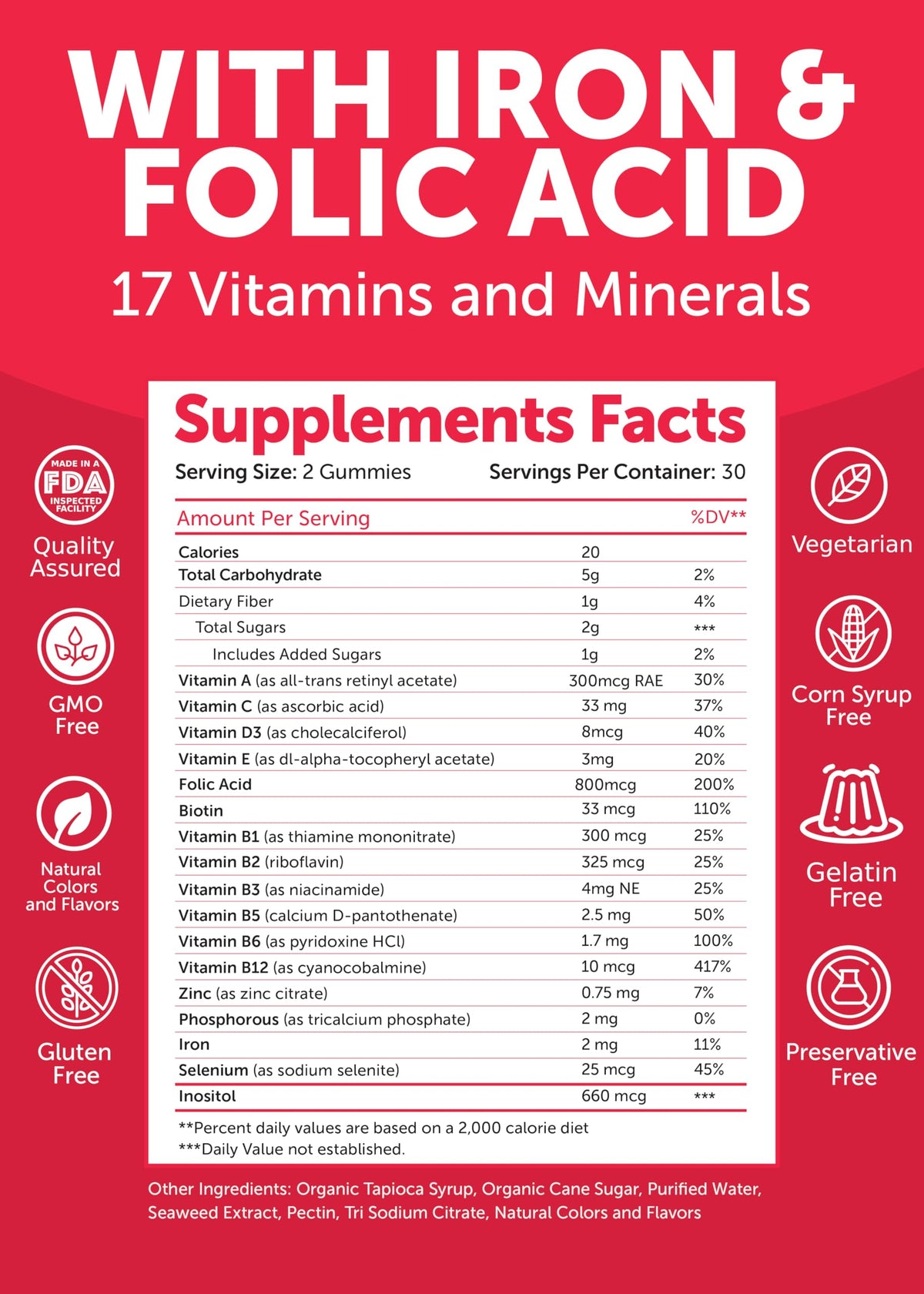 Ingredients: Vitamin A, Vitamin C, Vitamin D3, Vitamin E, Folic Acid, Biotin, Vitamin B1, Vitamin B2, Vitamin B3, Vitamin B5, Vitamin B6, Vitamin B12, Zinc, Phosphorous, Iron, Selenium, Inositol, Organic Tapioca Syrup, Organic Cane Sugar, Purified Water, Organic Seaweed Extract, Tri Sodium Citrate, Natural Colors and Flavors Vitamin A 1000IU, Vitamin C 33mg , Vitamin D3 333IU, Vitamin E 5IU, Folic Acid 800mcg, Biotin 33mcg, Vitamin B1 330 mcg, Vitamin B2 330 mcg, Vitamin B3 5mg, Vitamin B6 1.6mg, Vitamin B12 10mcg, Zinc 0.75mg, Phosphorus 2mg, Iron 2mg, Selenium 25mg, Inositol 660mcg