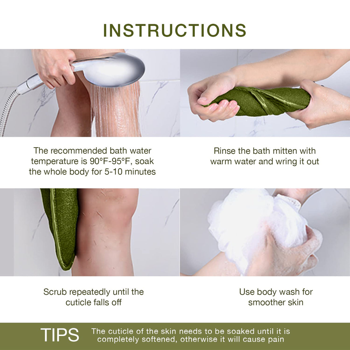 How to use Lupure Deep Exfoliating Mitts Step 1 Soften your Skin Take steam bath or warm shower or soaking in the tub for 510 minutes and Soften your skin and ready for easy exfoliation Step 2 Wet the Glove, Start to Scrub Wet and wring out the glove, wear the glove and use soap or body wash on the exfoliator glove and start scrubbing your body in circular motion from shoulders to toes evenly for better results. Step 3 Rinse off Dead Skin You will see dead skin rolling off and revealing super smooth and soft skin. Avoid facial and any sensitive area. Rinse off all the foam and dead skin thoroughly with water. Step 4 Wash and Moisturize your Body Finally wash your body with your favorite cleanser and apply moisturizer. Hand wash your exfoliating mitts and let it air dry for next use