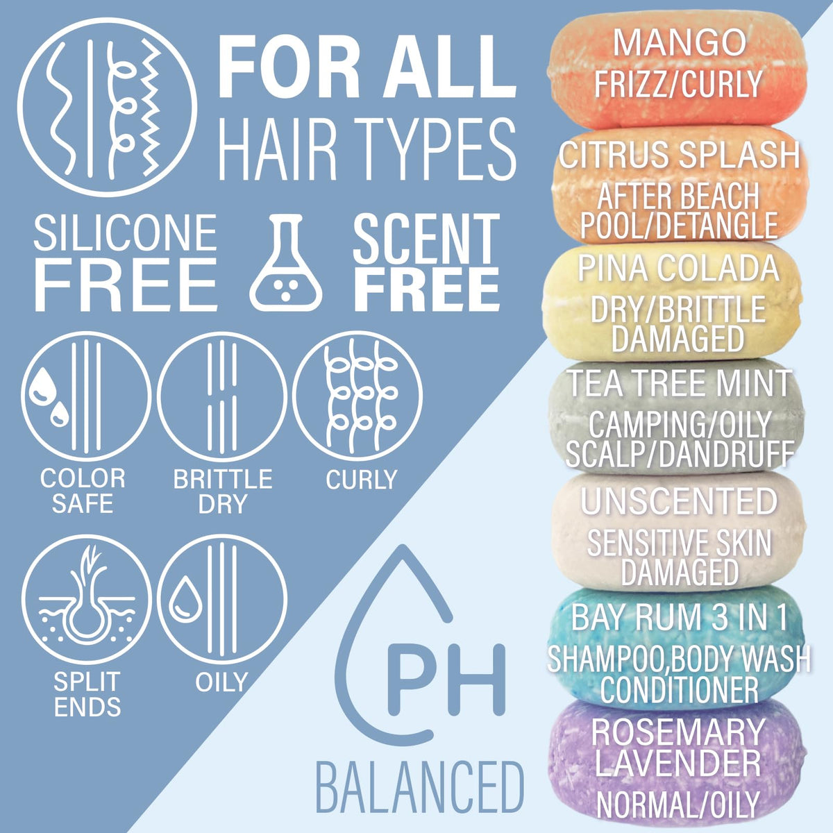| product benefit | MultiUse Convenience Combines shampoo, conditioner, and body wash in one bar, saving time and space., EcoFriendly Sustainable Reduces plastic waste by replacing up to two plastic bottles with each bar., Moisturizing Nourishing Plantbased ingredients hydrate and condition hair and skin without stripping natural oils., TSAFriendly Leakproof and compact, perfect for travel with no liquid restrictions., LongLasting CostEffective Each bar lasts 5075 uses, providing great value and reducing frequent purchases., Safe for All Hair Types Gentle on all hair types, including colortreated hair, for both men and women. |