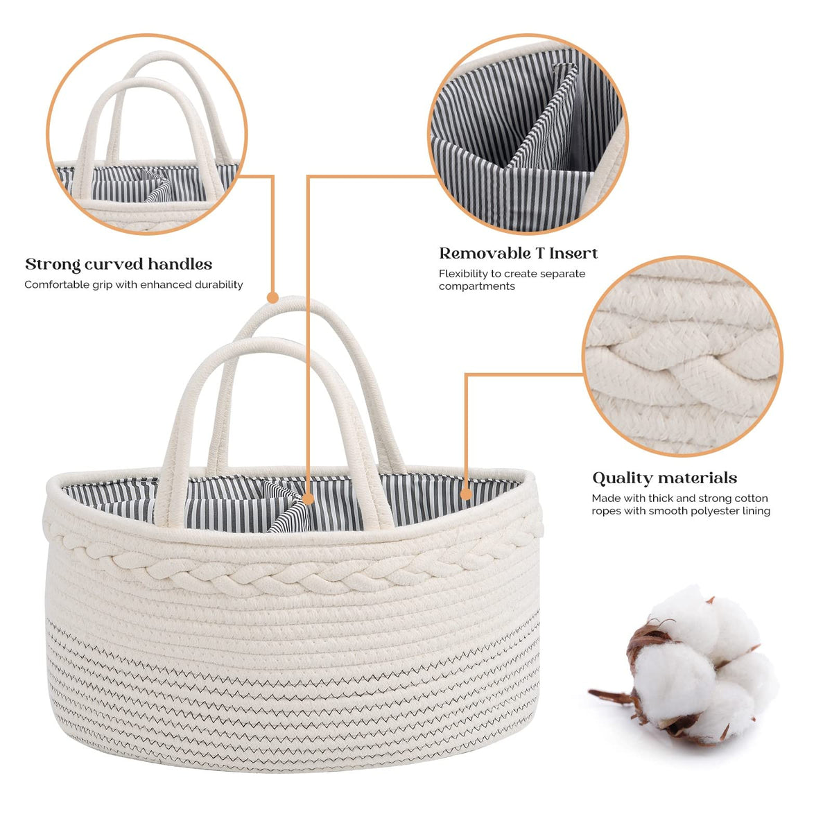 luxury little Diaper Caddy Organizer, Large Cotton Rope Nursery Baby Basket, Changing Table Organizer for Baby Diaper Storage, Portable Car Organizer with Removable Divider, Baby Shower Gifts - White