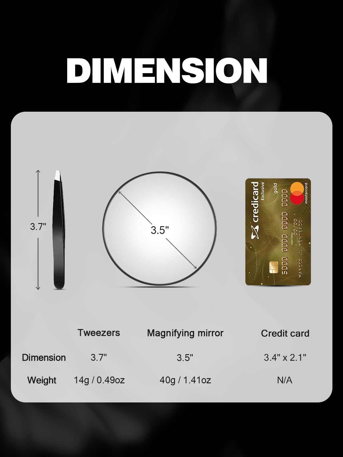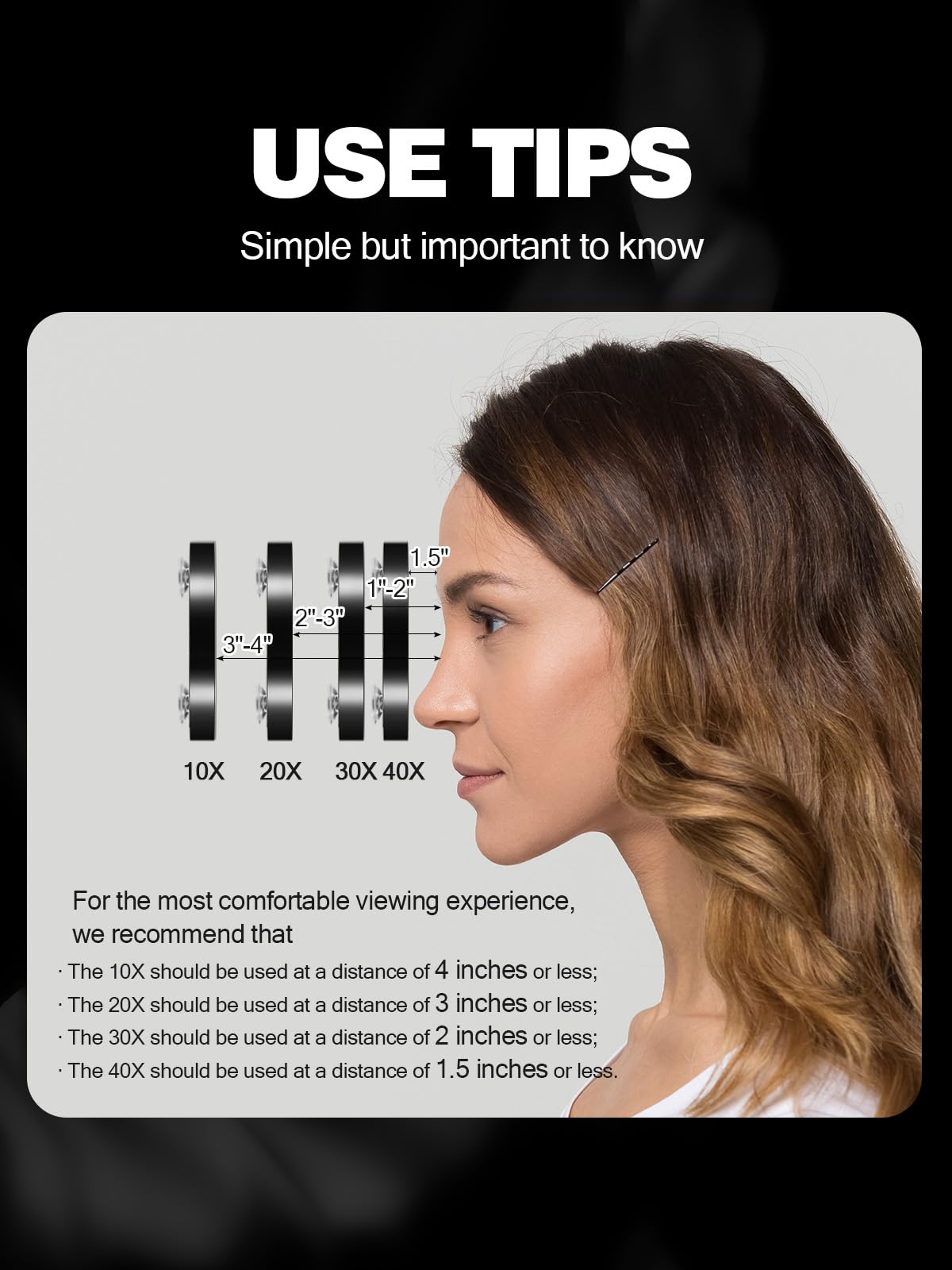| included components | 1 x 20X Magnifying Mirror, 1x 30X Magnifying Mirror, 1x 40X Magnifying Mirror, 1x Tweezers, 6x Suction Cups |
