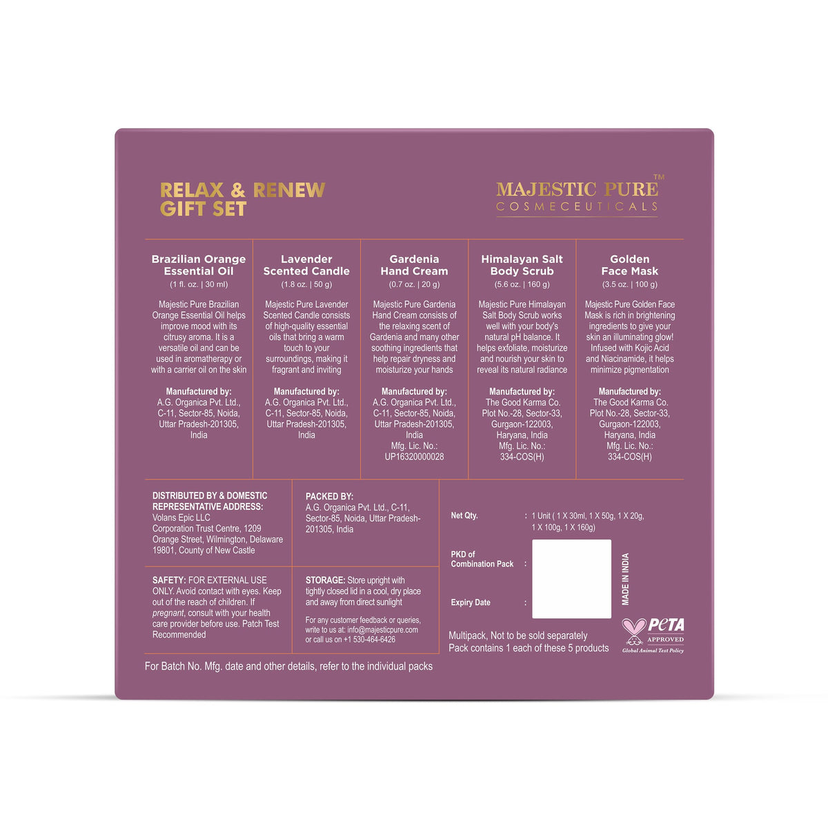 Majestic Pure Gift Set set of 5- (Brazilian Orange oil 1oz, Scented Candle - 50g, Gardenia Hand Cream - 20g, Himalayan Salt Body Scrub - 160g, Gold Face Mask - 100g)