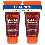 Experience long-lasting freshness on-the-go with our Mando Whole Body Deodorant Mini Travel Size Invisible Cream Tube. This innovative formula provides 72-hour odor control without the use of aluminum or baking soda, ensuring skin safety and comfort. Pack of 2 in Bourbon Leather scent.