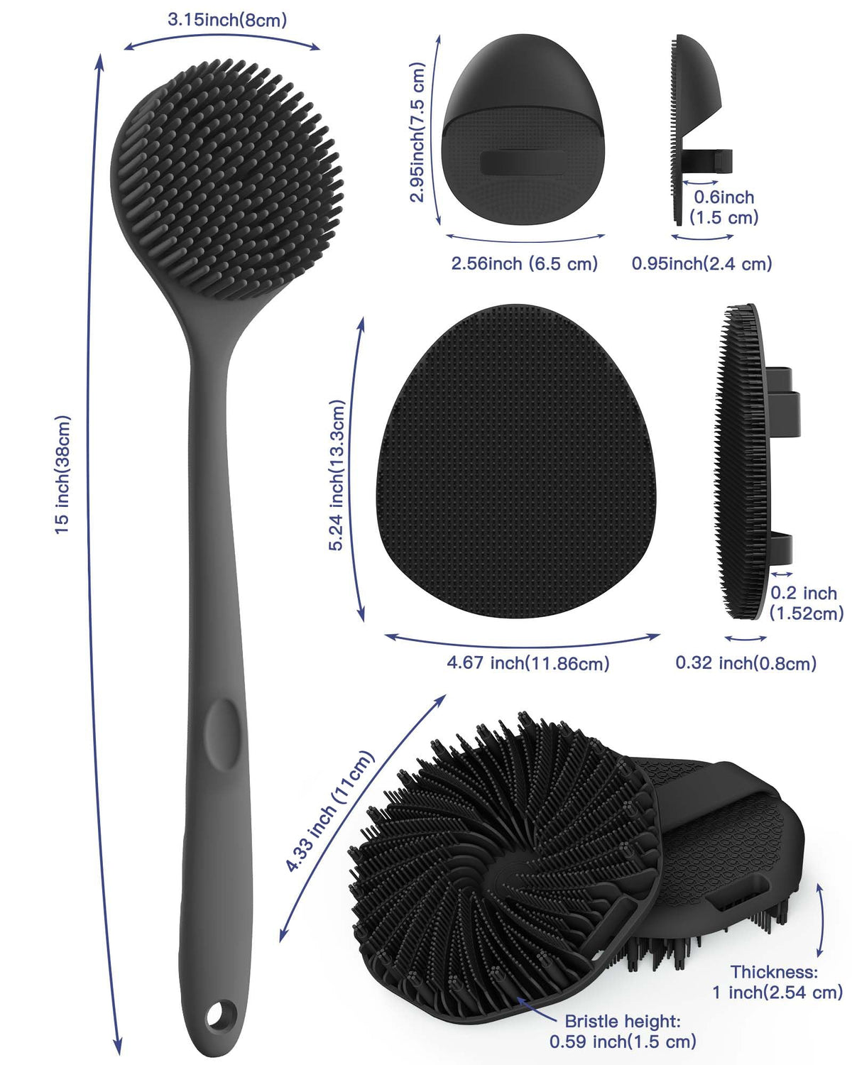 Manmihealth Silicone Back Scrubber & Soft Bath Glove Set 4 PCS(Thick Bristles), Super-Exfoliating Body Scrubber & Super-Lathering Shower Brush Combination, with 2 Free Hooks (Black)