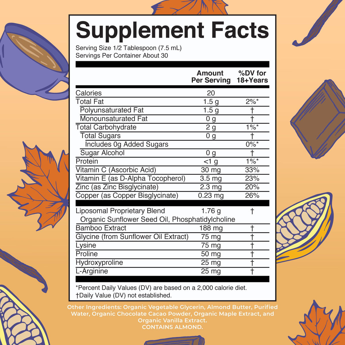 Ingredients: Vitamin C Ascorbic Acid 30 milligrams, Vitamin E as DAlpha Tocopherol 3.5 milligrams, Zinc as Zinc Bisglycinate 2.25 milligrams, Copper as Copper Bisglycinate 0.23 milligrams, Liposomal Proprietary Blend 1.75 milligrams, Organic Sunflower Seed Oil, Bamboo Extract 188 milligrams, Glycine from Sunflower Oil Extract 75 milligrams, Lysine 75 milligrams, Proline 50 milligrams, Hydroxyproline 25 milligrams, Larginine 25 milligrams, Phosphatidylcholine 5 milligrams,Organic Vegetable Glycerin, Almond Butter, Purified Water, Organic Chocolate Cacao Powder, Organic Maple Extract, and Organic Vanilla Extract,Almonds