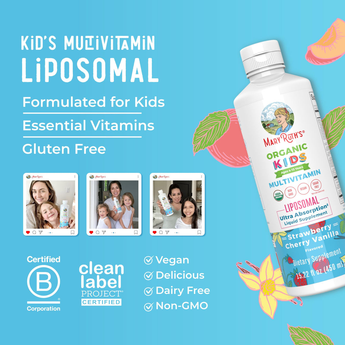 - MaryRuth's Kids Multivitamin Liposomal: With 3 flavors in one bottle: Strawberry Cherry & Vanilla, this vegan multivitamin is formulated to support your child's daily health! Just one serving per day provides your child with vitamin A, vitamin C, vitamin D3, B12, Zinc, and more.
