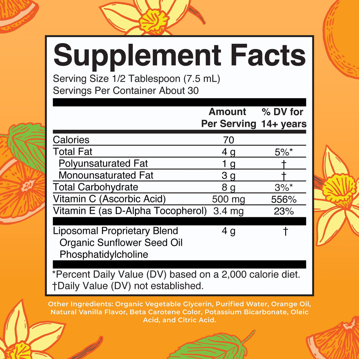Ingredients :: Vitamin C Liposomal Proprietary Blend* | Vitamin C | Vitamin E |Glycerin | *Vitamin C Liposomal Proprietary Blend (Sunflower oil | Phosphatidylcholine | Vitamin C as Ascorbic Acid) | Purified Water | Citrus oil and Vanilla (Natural Flavors) | Vitamin E | Beta Carotene (natural color) | Potassium Bicarbonate | Oleic Acid | and Citric Acid