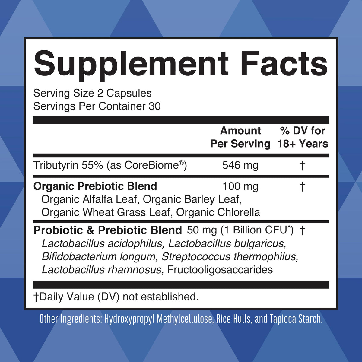 Ingredients :: Organic Prebiotic Fiber Blend: Organic Alfalfa, Organic Barley Grass, Organic Wheat Grass, Organic Chlorella Probiotic Blend with Fructooligosaccharides: Lactobacillus acidophilus, Lactobacillus bulgaricus, Bifidobacterium longum, Streptococcus thermophilus, Lactobacillus rhamnosus Other Ingredients: Other Ingredients: Cellulose, Guar Gum, Rice Hulls, and Organic Tapioca Starch
