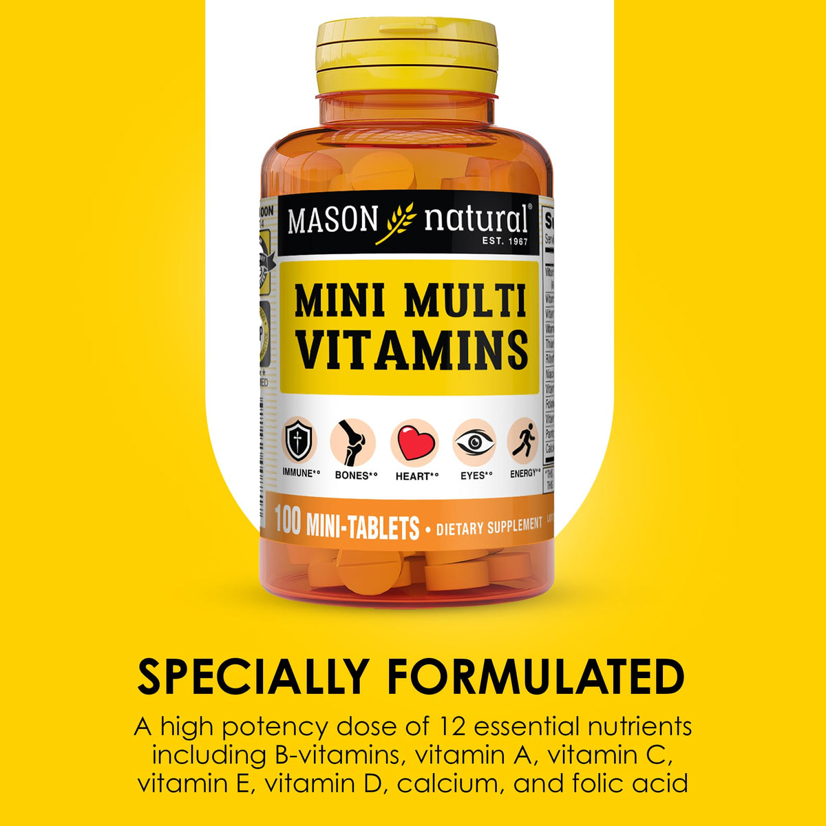 MASON NATURAL Mini Multi Vitamins provide Vitamins A, C, D3, E, B1, B2, B3, B6, B12, Folate, and Calcium for Overall Health. This pack offers a 300 Day Supply.