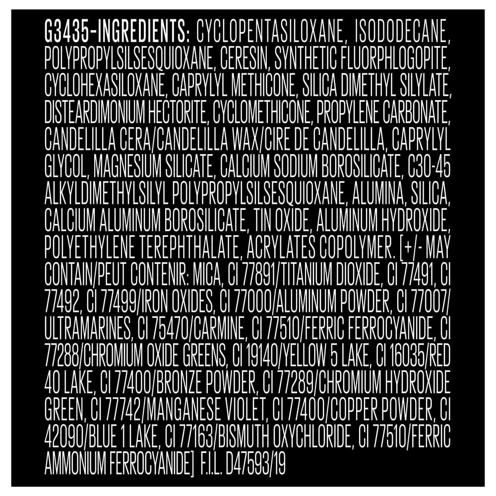 Ingredients: G3435 INGREDIENTS CYCLOPENTASILOXANE ISODODECANE POLYPROPYLSILSESQUIOXANE CERESIN SYNTHETIC FLUORPHLOGOPITE CYCLOHEXASILOXANE CAPRYLYL METHICONE SILICA DIMETHYL SILYLATE DISTEARDIMONIUM HECTORITE CYCLOMETHICONE PROPYLENE CARBONATE CANDELILLA CERA CANDELILLA WAX CIRE DE CANDELILLA CAPRYLYL GLYCOL MAGNESIUM SILICATE CALCIUM SODIUM BOROSILICATE C3045 ALKYLDIMETHYLSILYL POLYPROPYLSILSESQUIOXANE ALUMINA SILICA CALCIUM ALUMINUM BOROSILICATE TIN OXIDE ALUMINUM HYDROXIDE POLYETHYLENE TEREPHTHALATE ACRYLATES COPOLYMER MAY CONTAIN PEUT CONTENIR MICA CI 77891 TITANIUM DIOXIDE CI 77491, CI 77492, CI 77499 IRON OXIDES CI 77000 ALUMINUM POWDER CI 77007 ULTRAMARINES CI 75470 CARMINE CI 77510 FERRIC FERROCYANIDE CI 77288 CHROMIUM OXIDE GREENS CI 19140 YELLOW 5 LAKE CI 16035 RED 40 LAKE CI 77400 BRONZE POWDER CI 77289 CHROMIUM HYDROXIDE GREEN CI 77742 MANGANESE VIOLET CI 77400 COPPER POWDER CI 42090 BLUE 1 LAKE CI 77163 BISMUTH OXYCHLORIDE CI 77510 FERRIC AMMONIUM FERROCYANIDE F.I.L. D4759319